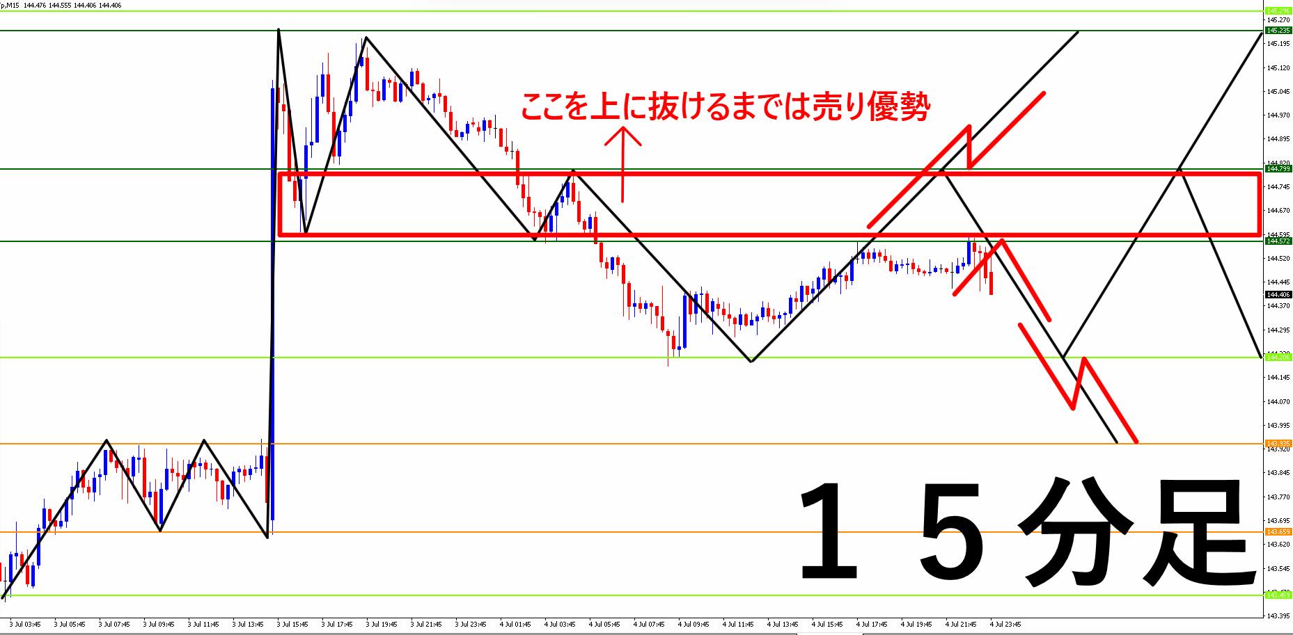 15分足レベルでは、赤い四角の枠を上位に抜けるまでは売り優勢