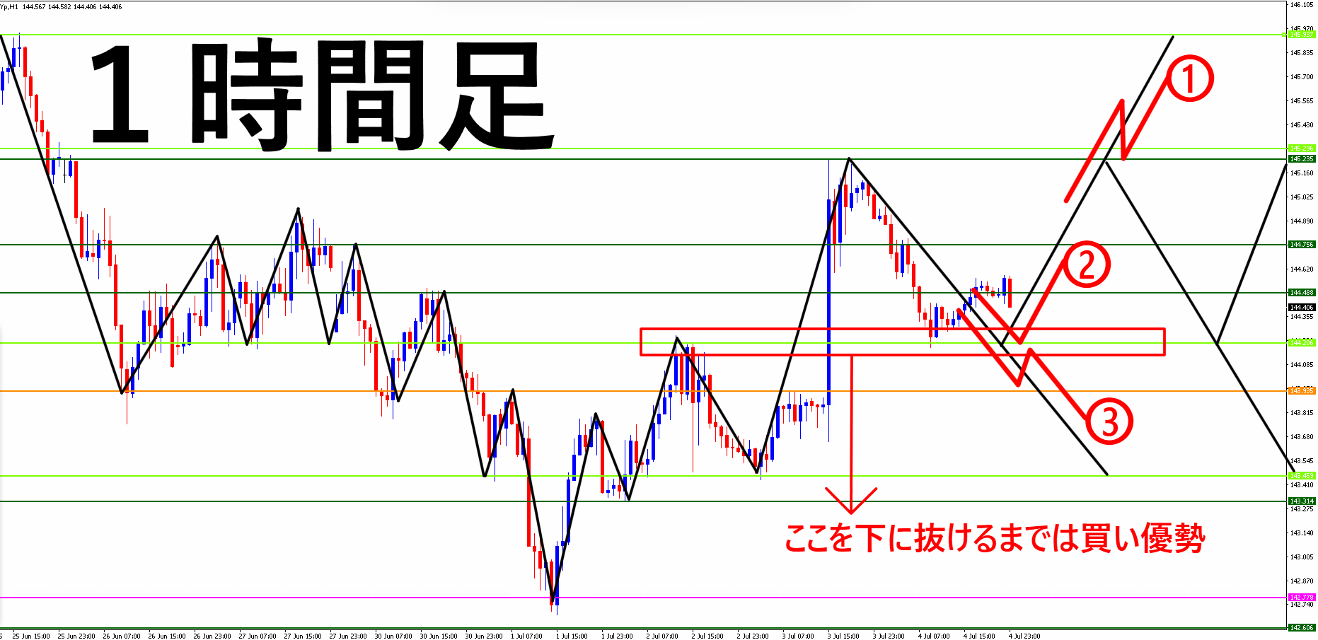 3つのエントリーは添付画像の1時間足の赤丸①~③になります。 144.216円あたりが機能すれば赤丸②で買い。 145.235円を上に抜けたあとの、赤丸①での押し目買い。 144.216円を下に抜けた場合は、赤丸③の戻り売りを狙っていく。
