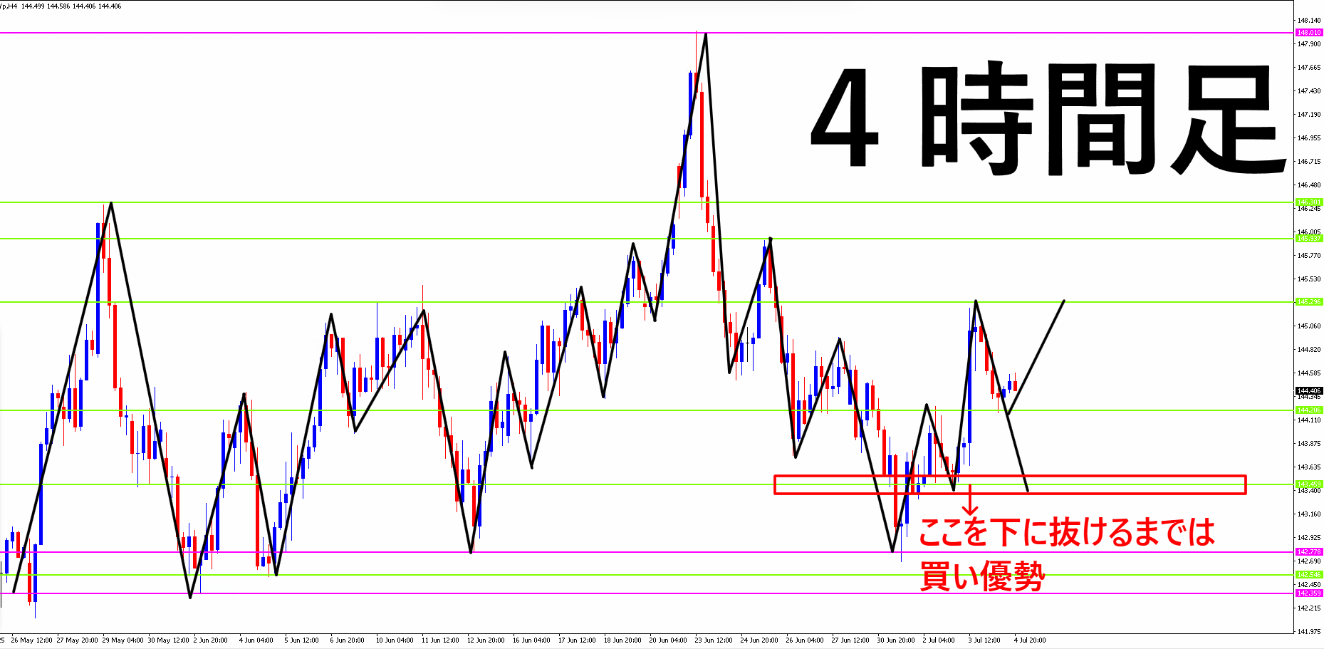 4時間足は買いに優位性があり、現在の位置がロールリバーサルされて押し目買いになるのか?という相場状況。