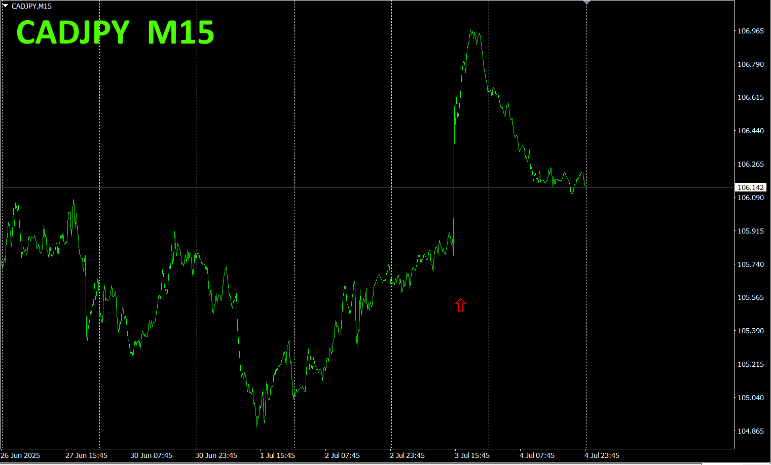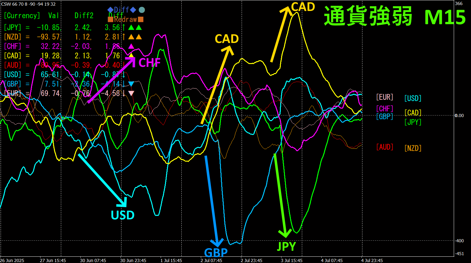 15分足の通貨強弱グラフを見ると、USDとCHF、GBPとCAD、JPYとCADが、見事な逆相関関係になっていることがわかります。大きく伸びて、逆相関関係にある通貨ペアを選べば良いのです。