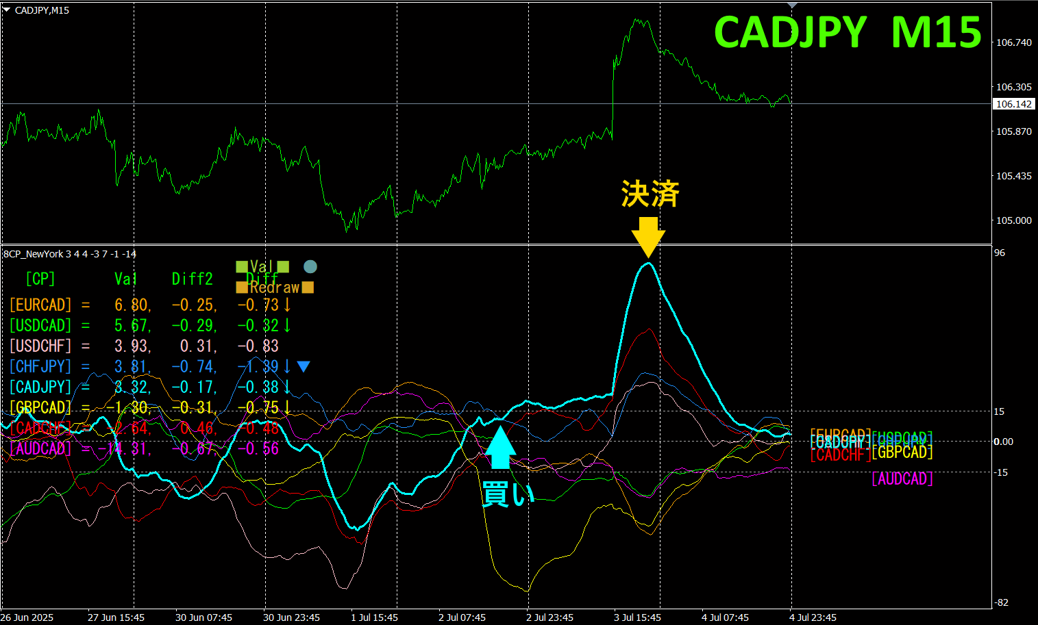 上半分は、CADJPYの15分足チャートです。下半分は、「8CP見える化インジケータ」によるものです、水色太線のグラフがCADJPYに相当します。