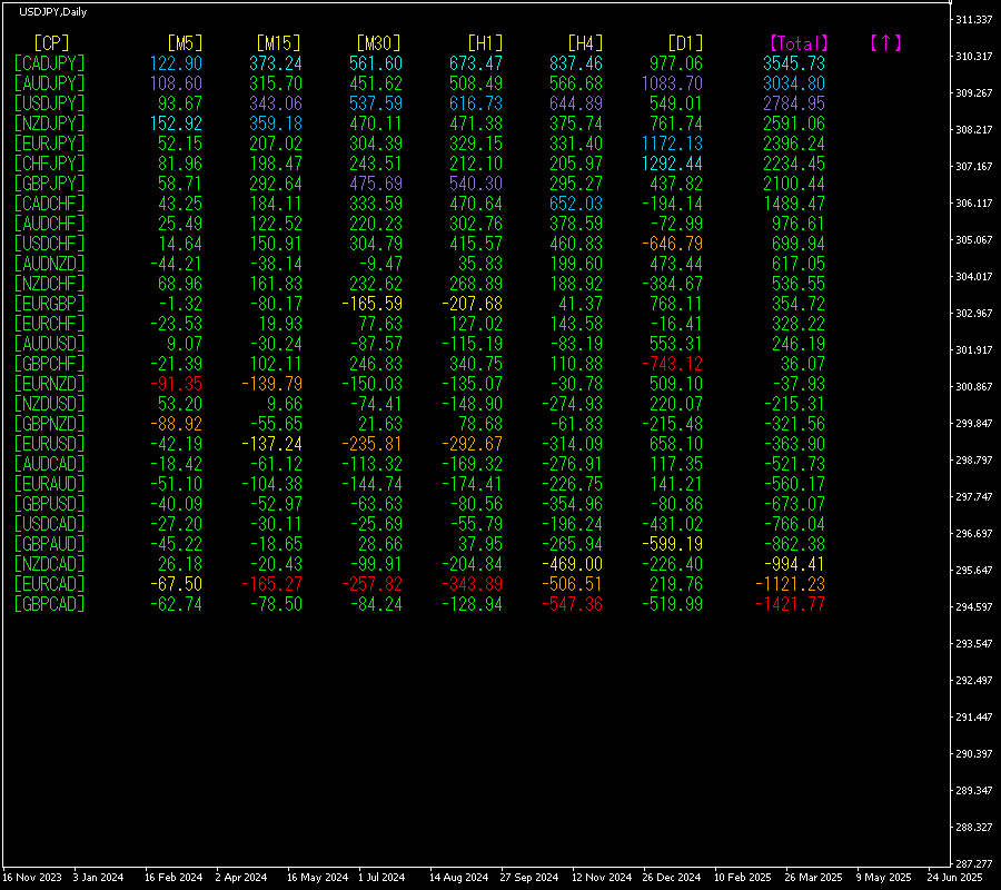 [Total]数値の降順に並んでいます。一番上にあるCADJPYは、[D1]を除く全ての時間足で青色系の表示色になっています。Total数値が+3545.73と、大きいプラスの数字になっています。全ての時間足で、CADJPYに上昇トレンドが発生していることが明らかです。