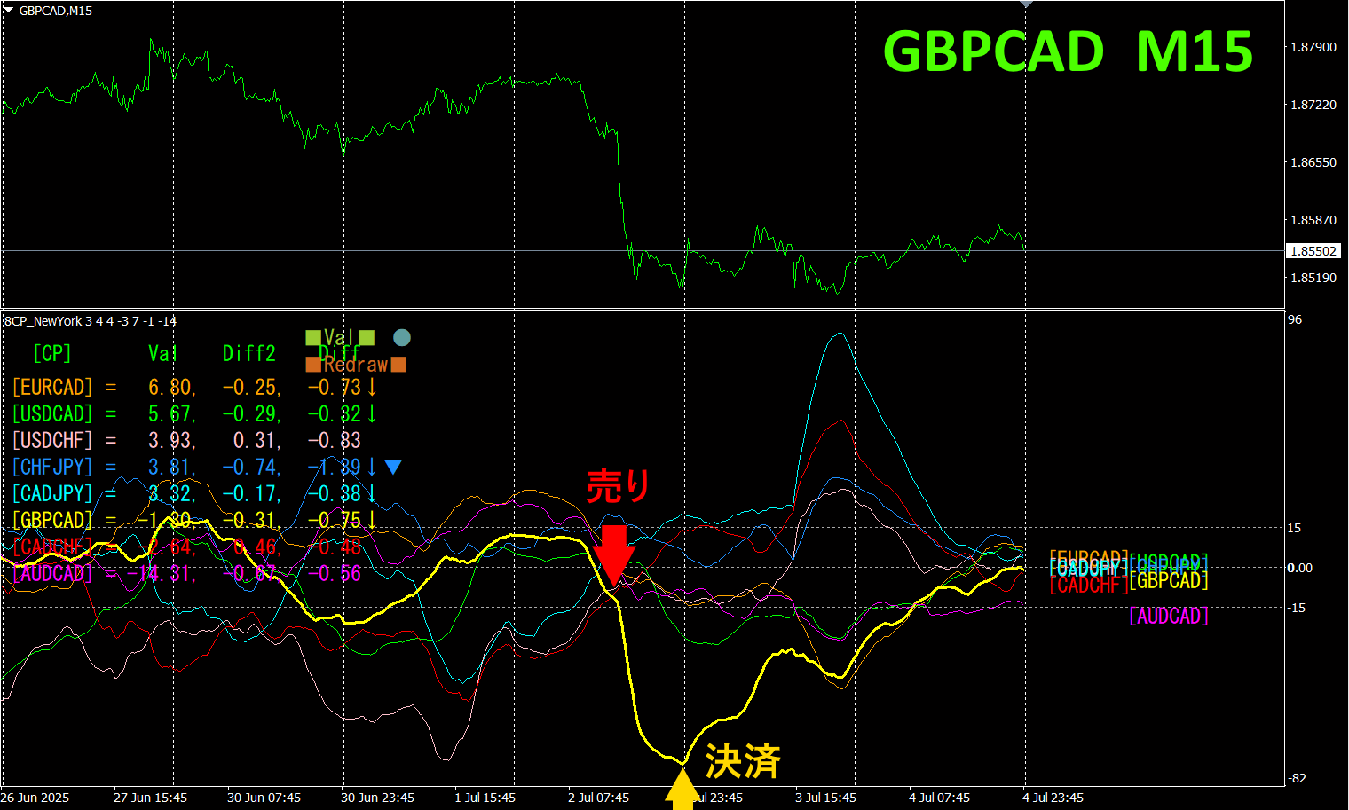 上半分は、GBPCADの15分足チャートです。下半分は、「8CP見える化インジケータ」によるものです、黄色太線のグラフがGBPCADに相当します。