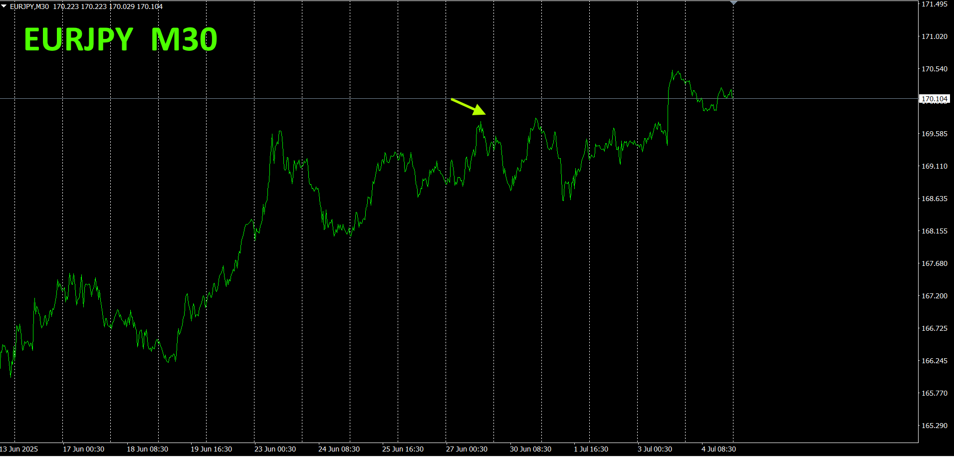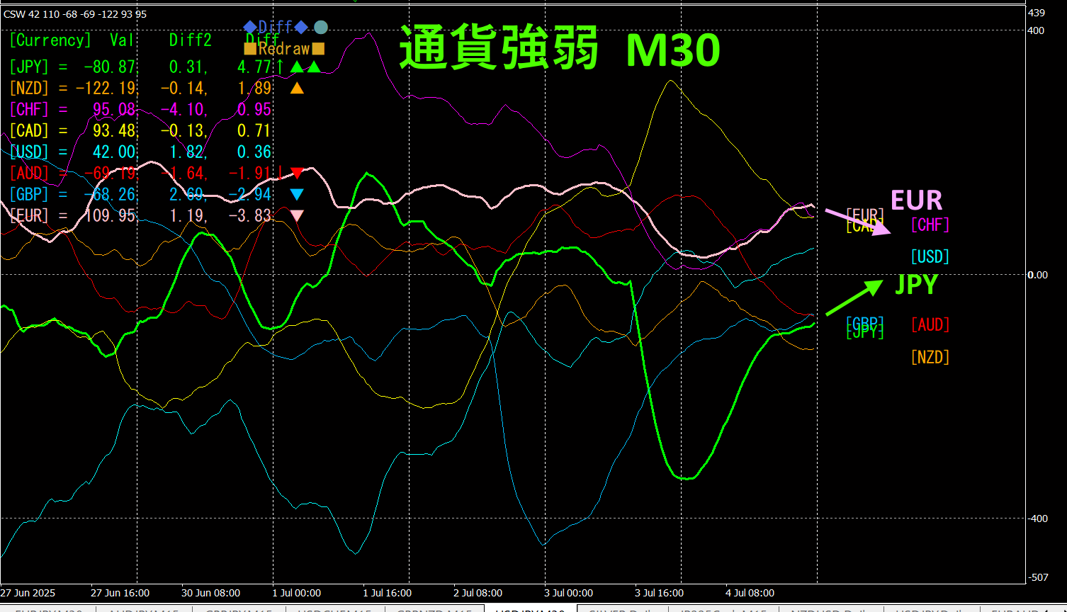 ピンク色がEUR、緑色がJPYです。EURとJPYは、通貨強弱が逆相関関係になっています。通貨強弱チャートで、EURはやや下向き、JPYは上向きになっているので、EURJPYは、下落方向に向かうと考えられます。