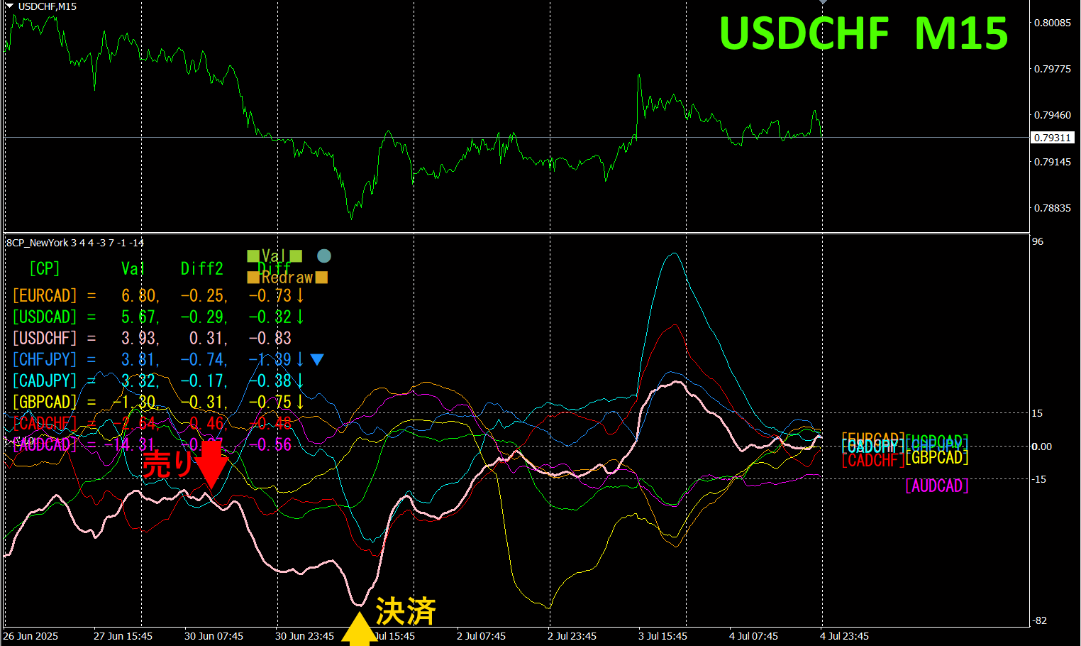 上半分は、USDCHFの15分足チャートです。下半分は、「8CP見える化インジケータ」によるものです、桃色太線のグラフがUSDCHFに相当します。