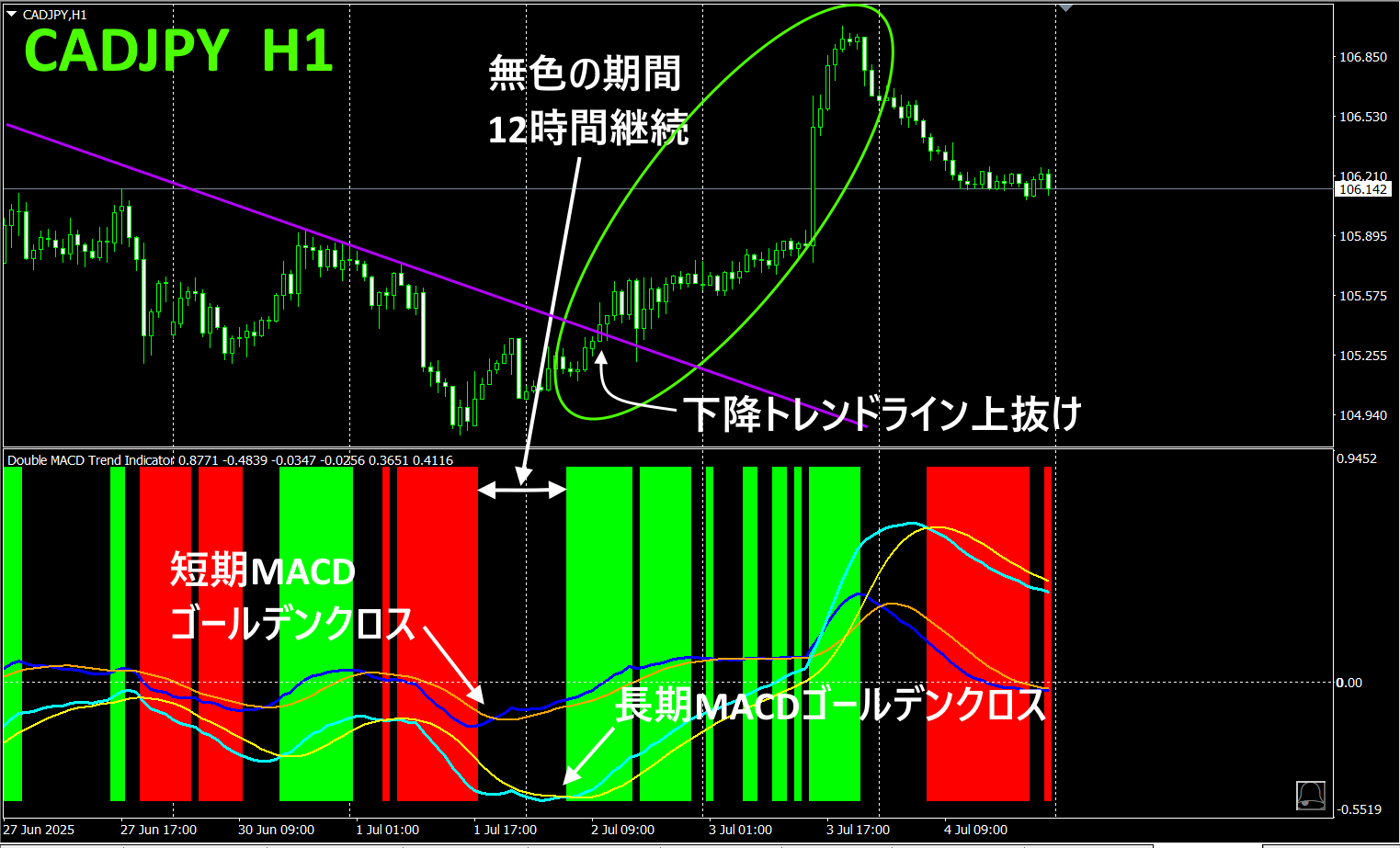 「Dual_MACD_Trend_Indicator」で、12時間の無色期間が継続した後に、緑色の幅広いゾーンが広がっています。短期MACDがマイナス領域でゴールデンクロスして、その後長期MACDがマイナス領域でゴールデンクロスしています。インジケータのカラーが無色から緑色に変わった所が、上昇トレンドの開始点になります。