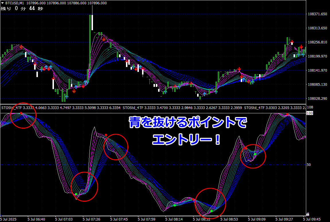 インジケーターの帯はピンク・緑・青の3層構造で、3層の帯は、収斂と拡散を繰り返しますので、 上昇時は、上から ピンク・緑・青 の並びとなり、下落時は、その逆で、上から青・緑・ピンクの並びになります。