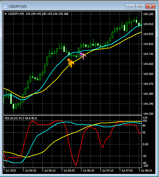 【RCIを極めて勝つ!!】mBDSR(移動平均線フィルター)とR1R2S2のサインの両方を活用する(7) ドル円 5分足