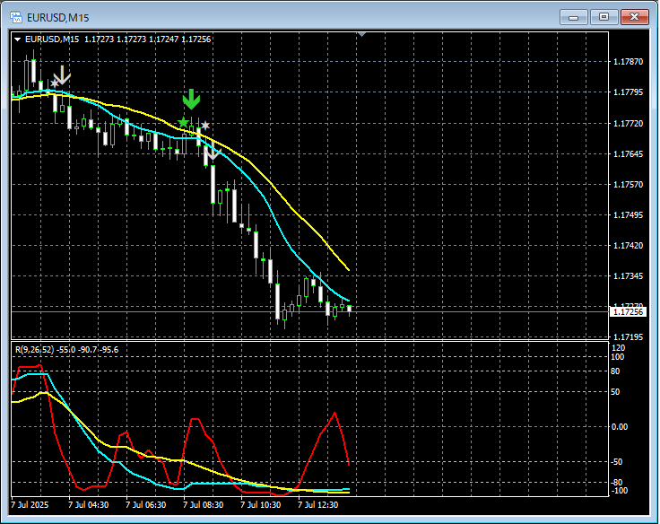 下記ではmBDSR(移動平均線フィルター)とR1R2S2のサインを同時に表示した例について紹介します。