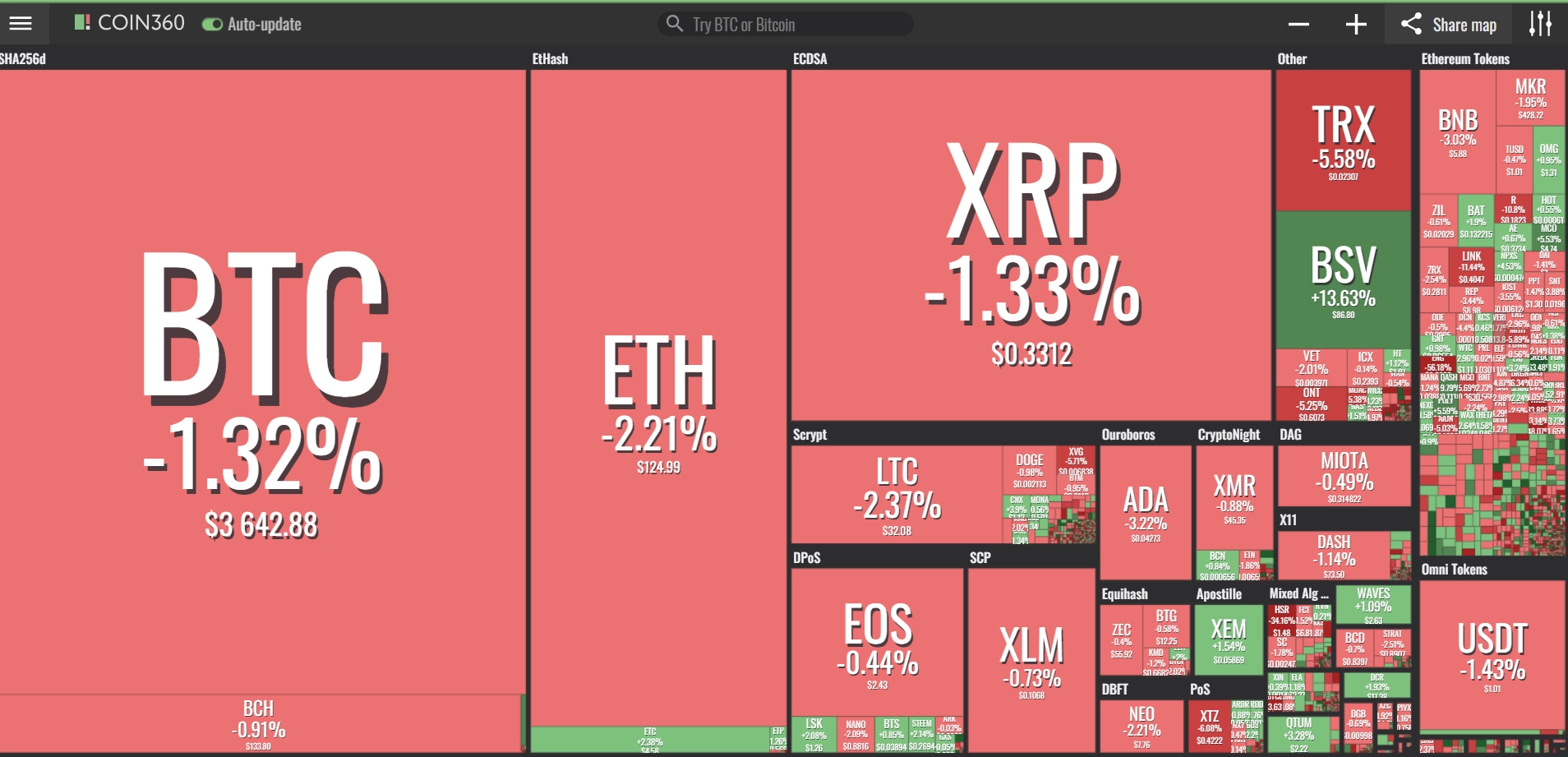 coinmarketcap(コインマーケットキャップ)のサイトから、ドミナンス(各銘柄が仮想通貨全体の時価総額に占めるパーセンテージ)を定点観測していきます。仮想通貨全般が下方向に大きく動き出している相場状況を受け、毎日更新することとし、仮想通貨業界を俯瞰および転換期を早期に発見することを目的とします。