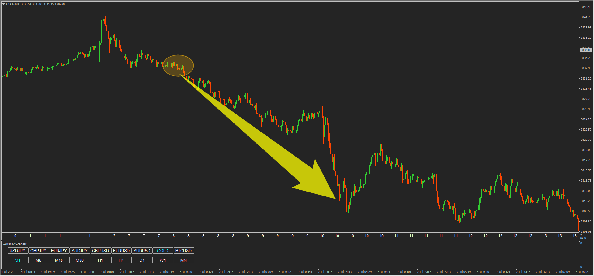 これは、今週の月曜日(2025年06月02日)のGOLDの1分足チャートです。