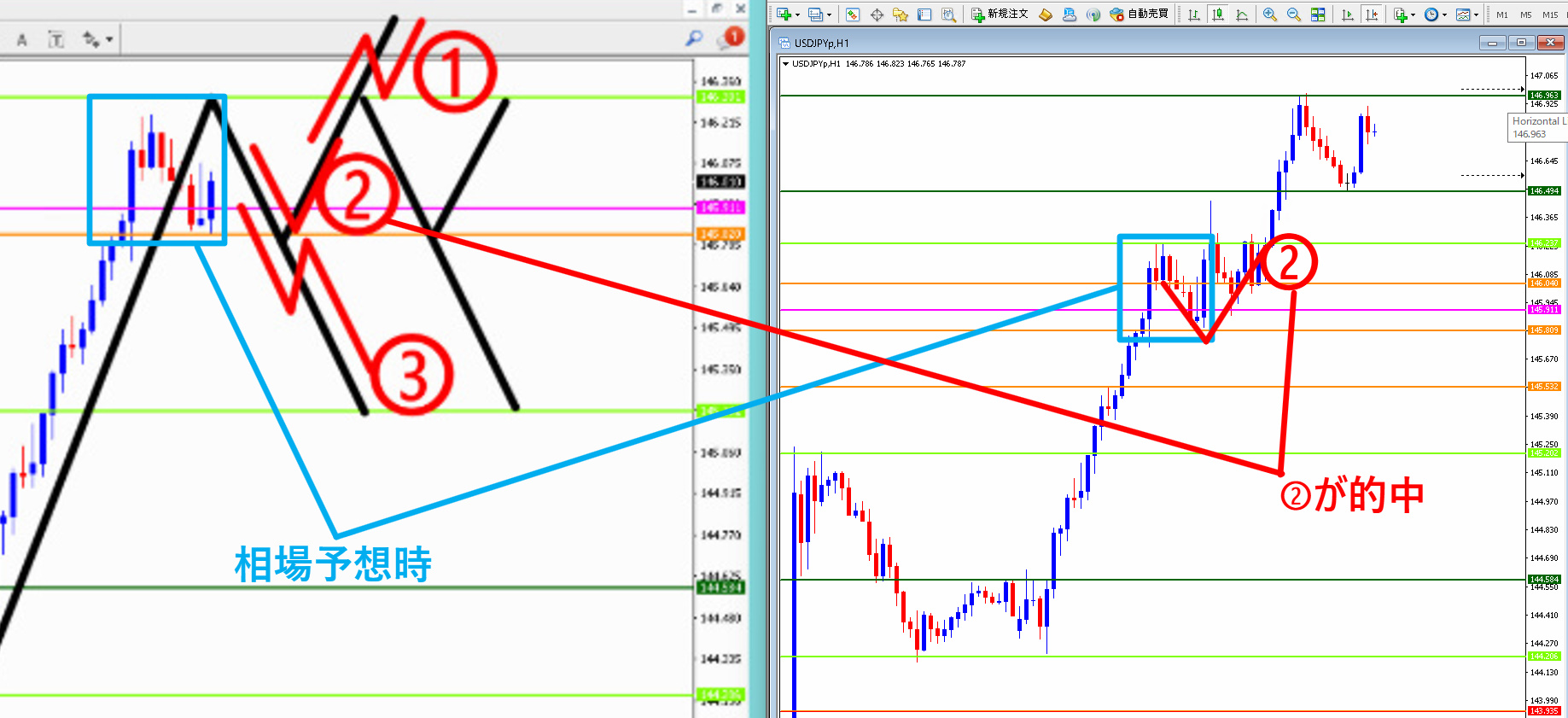 【左側:相場予想時のチャート】【右側:答え合わせ時のチャート】