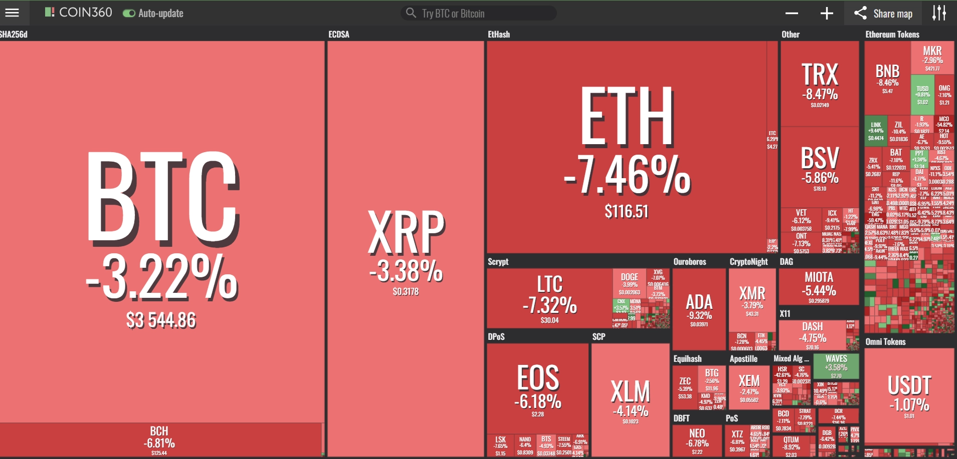 coinmarketcap(コインマーケットキャップ)のサイトから、ドミナンス(各銘柄が仮想通貨全体の時価総額に占めるパーセンテージ)を定点観測していきます。仮想通貨全般が下方向に大きく動き出している相場状況を受け、毎日更新することとし、仮想通貨業界を俯瞰および転換期を早期に発見することを目的とします。
