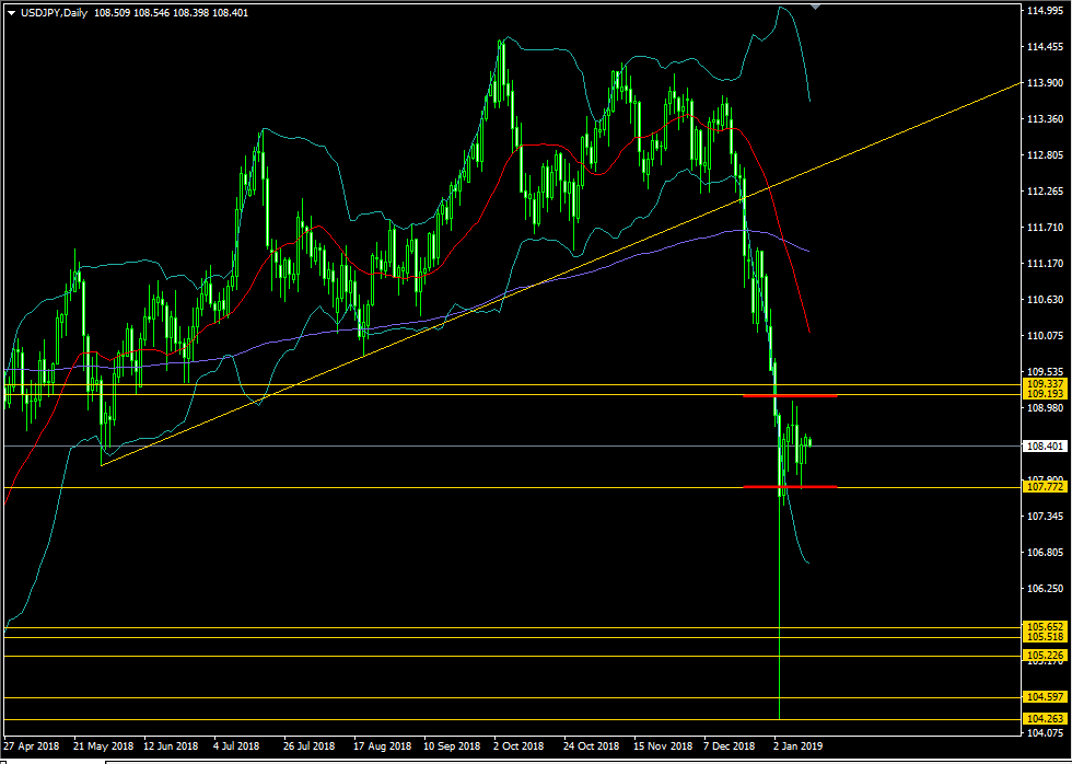 ドル円の日足チャートから見てみます。ドル円日足では、先日から引き続き109.193円のレジスタンスラインと107.772円のサポートラインに挟まれたレンジ内を推移しており、107.772円のサポートライン抜けを試しに下に行くと思われましたが、下には行かず再び上方向へフラフラ戻っていってしまいました。現在はこのドル円109.193円のレジスタンスラインと107.772円のサポートラインのちょうど真ん中に位置していて上にも下にも行かない状況となっています。指標発表で何かの材料が出ない限りはこのあたりをしばらく推移するものと予想されます。