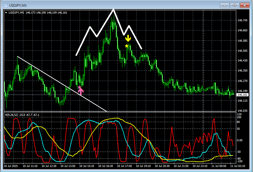 その後、結果として、三尊の右肩でmBDSR(RCI2本フィルター)の戻り売りサインが点灯してプライスはしっかり下げている。