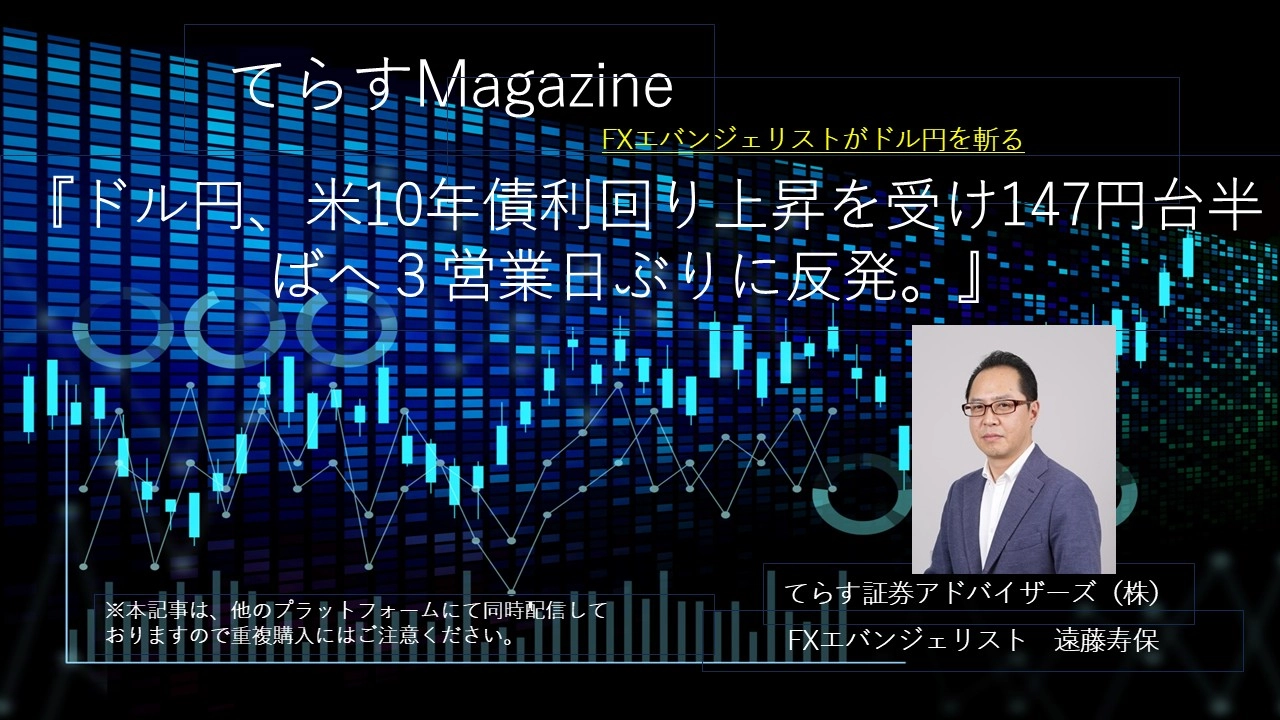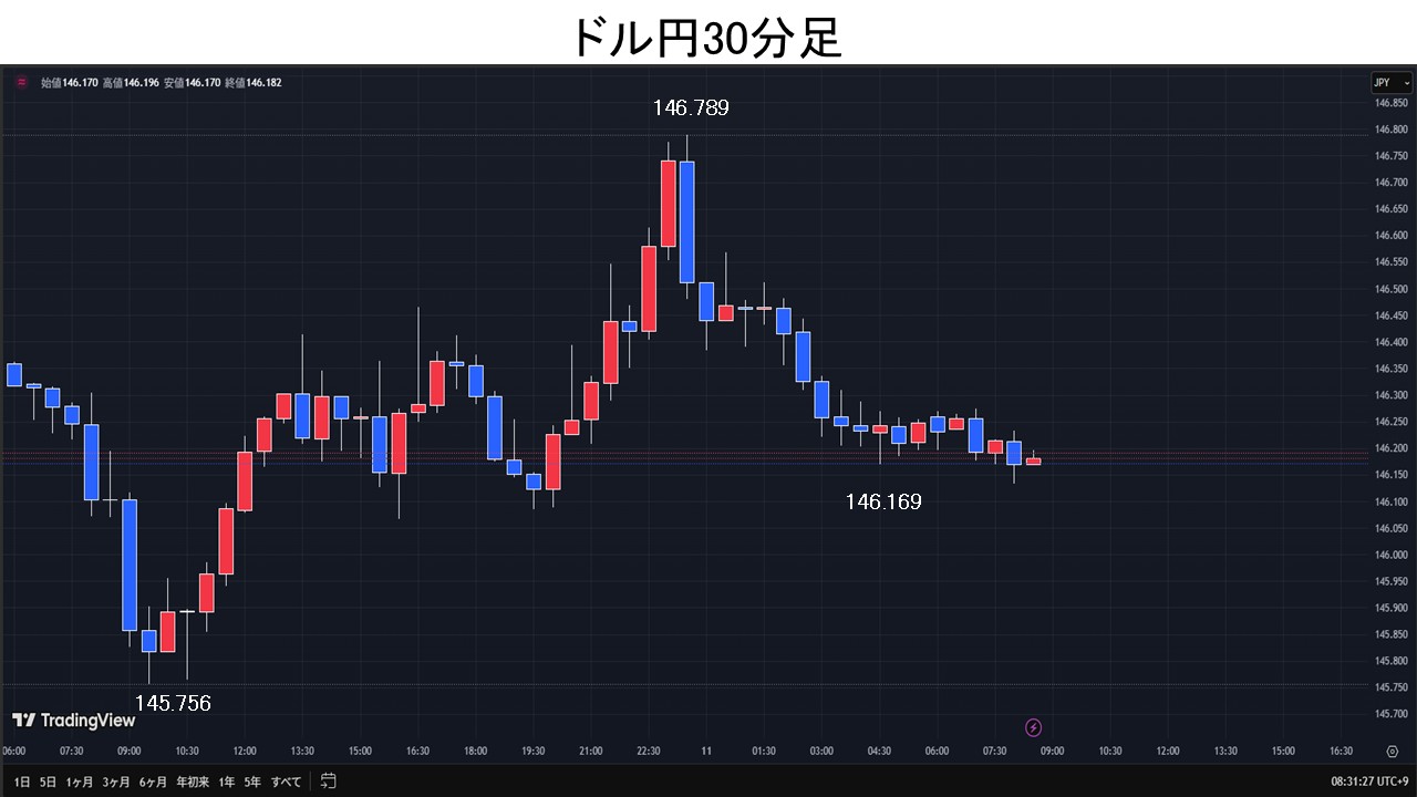 東京時間、ドル円は、前日からのドル売りの流れで145.75円まで下押し。その後、日経平均が一時下げ幅を縮小させた事もあり、146.41円まで買い戻された。欧州時間、ドル円は146.20円を挟む揉みあい。NY時間、前週分失業保険継続受給者数が予想を下振れた事や、米10年債利回りが上昇した事などを受け、ドル円は146.78円まで上昇。その後、米10年債利回りが徐々に上昇幅を縮小させると、ドル円は146.16円まで下落。