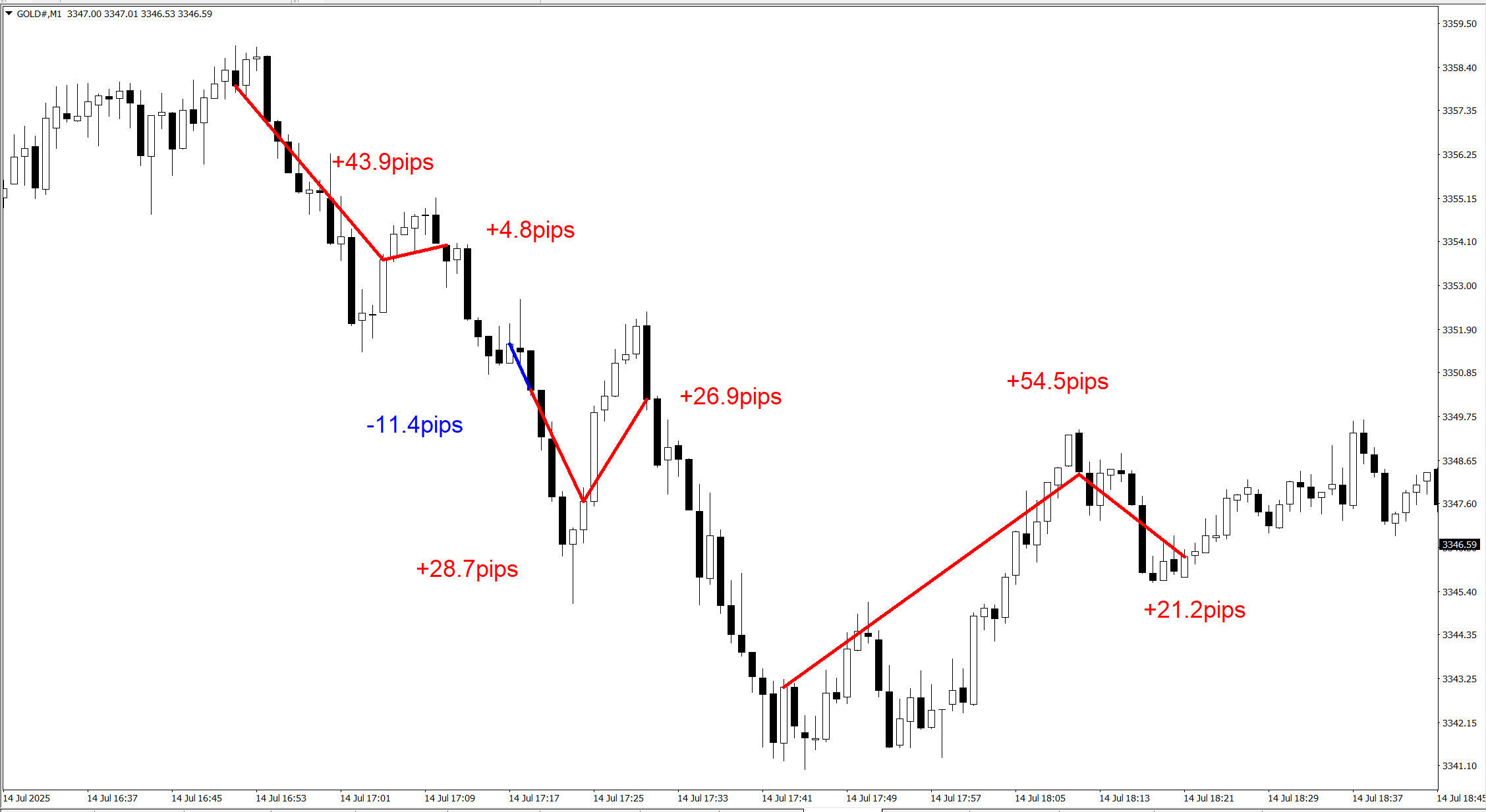 約1時間くらいで合計168.6pipsの利益となりました。