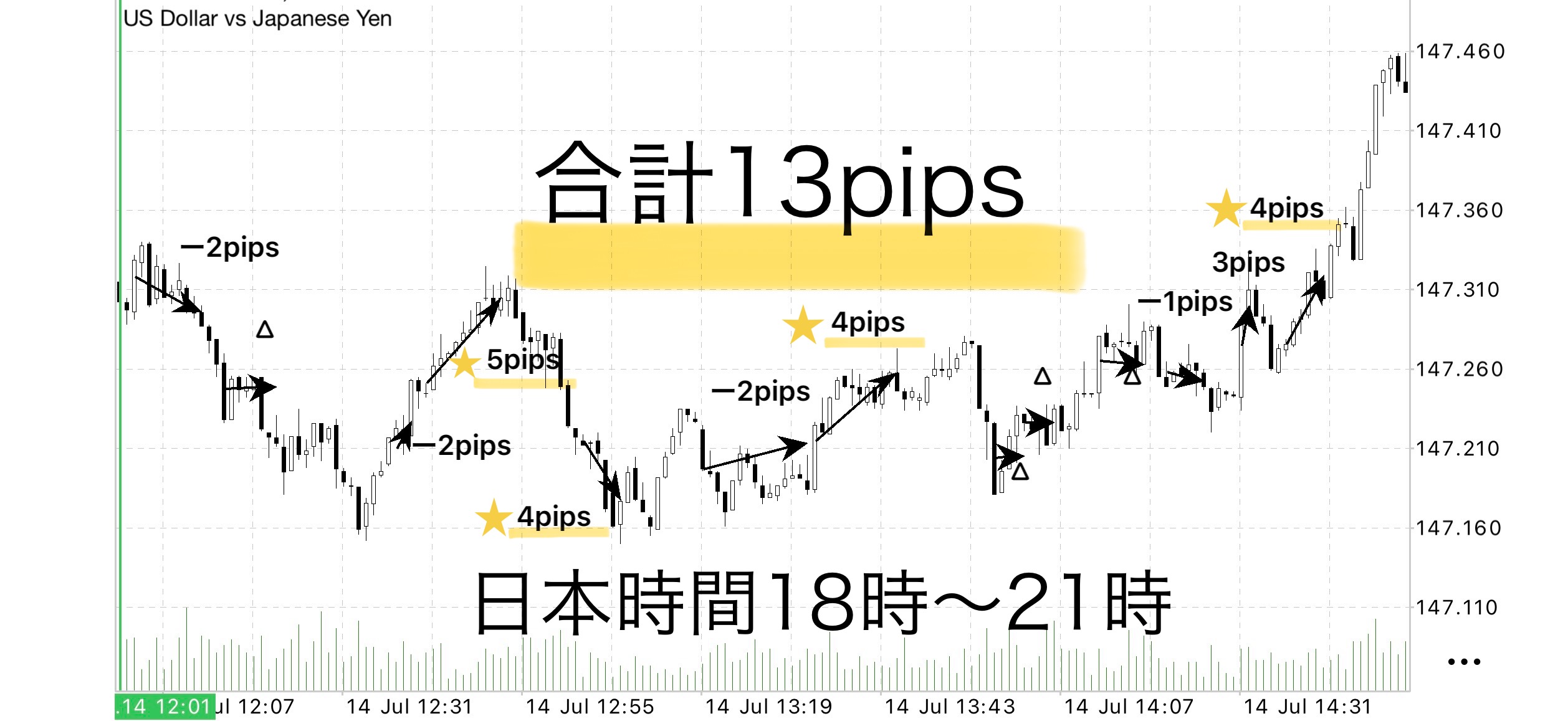 • 獲得:+20pips|損失:-7pips → 総損益:+13pips