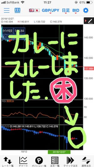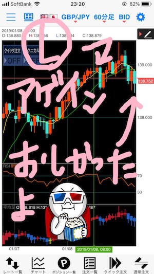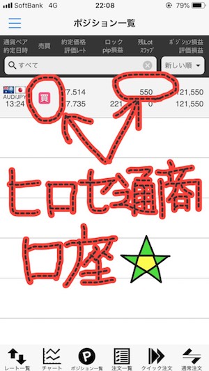 今度はヒロセ通商の買いポジションにも、DMMFXの売りポジションにもOCO注文で決済を入れたので、急に大きく動いても両方の口座がそのときのレートで決済されるだけ。為替差益による勝ち負けはありません。安心安心。