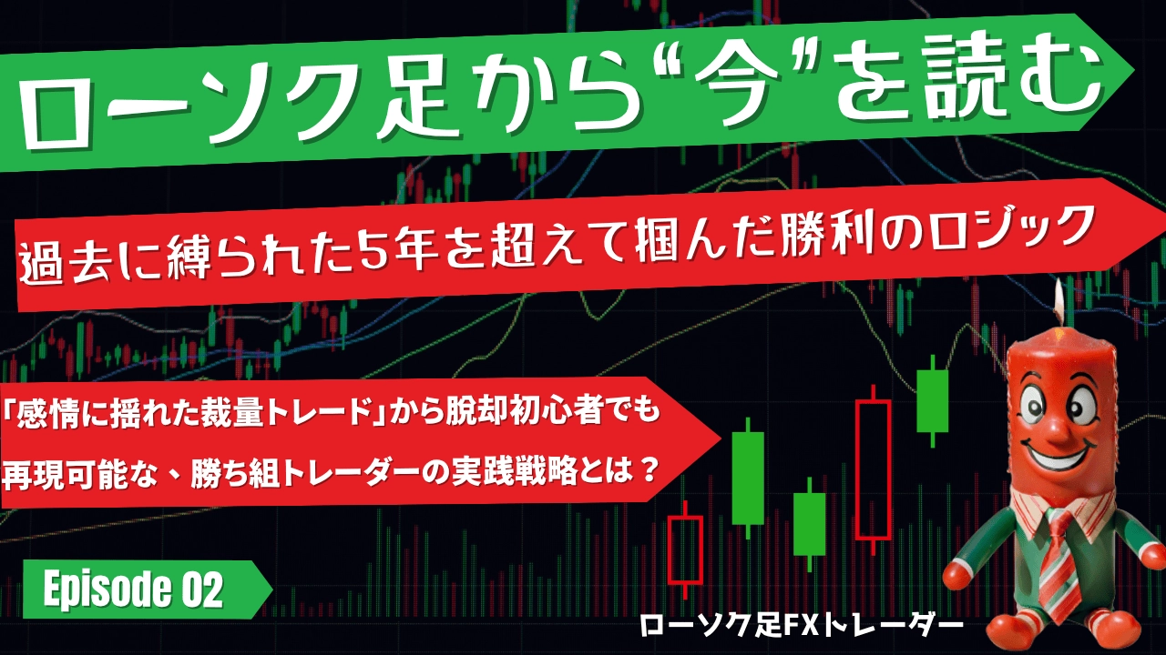 今回のゲストは、5年間まったく勝てなかった時期を経て、「ローソク足」だけで戦う独自のトレードスタイルを築き上げた専業トレーダー、ローソク足FXトレーダー様です。専業トレーダーとして15年以上のキャリアをお持ちで、これまでの経験をもとに、再現性のある“無裁量トレード”を追求されています。