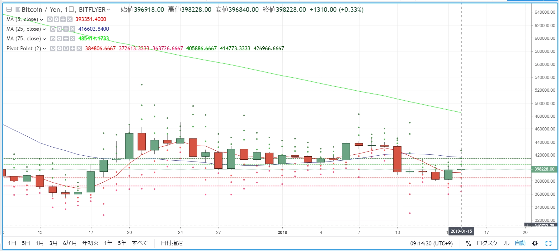 画像は2019年1月16日のキャプチャ。前日は主要銘柄で4~11%の上昇を示し、全面的に「緑」の相場環境でした。ところが今日は全面的に「赤」となっており、主要どころは2~7%の下落を見せています。