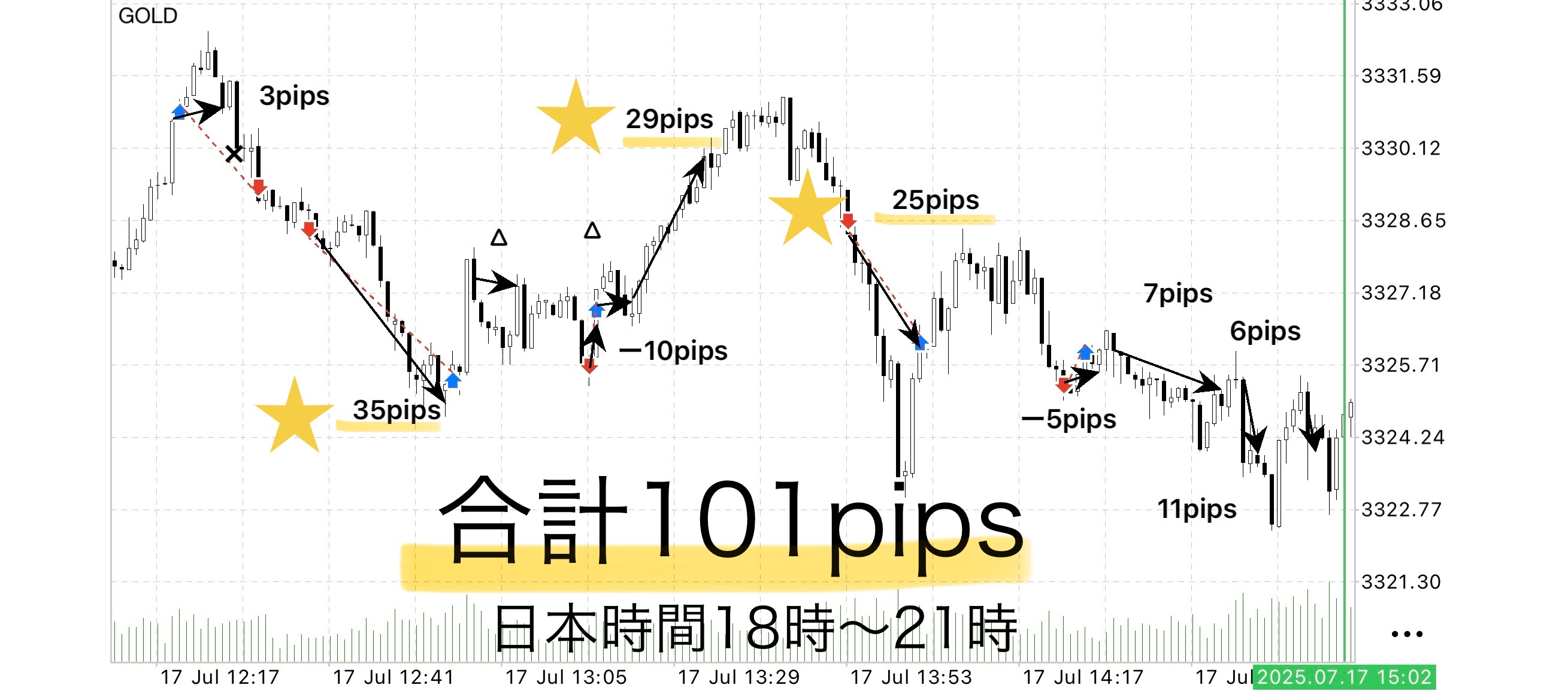 • 🔵 青矢印:本来利確できていたであろう位置(ゾーン判断での裁量利確の目安)