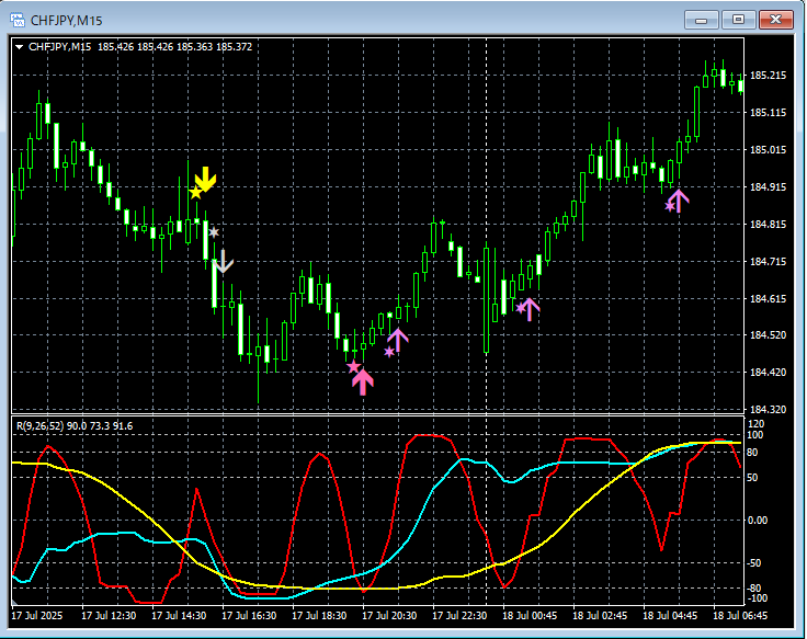 上の15分足では、mBDSR(RCI2本フィルター)の戻り売りサイン→R1R2S2の戻り売りサイン→mBDSR(RCI2本フィルター)の押し目買いサイン→R1R2S2の押し目買いサイン→R1R2S2の押し目買いサイン→R1R2S2の押し目買いサインの順番でサインがタイミングよく点灯している。
