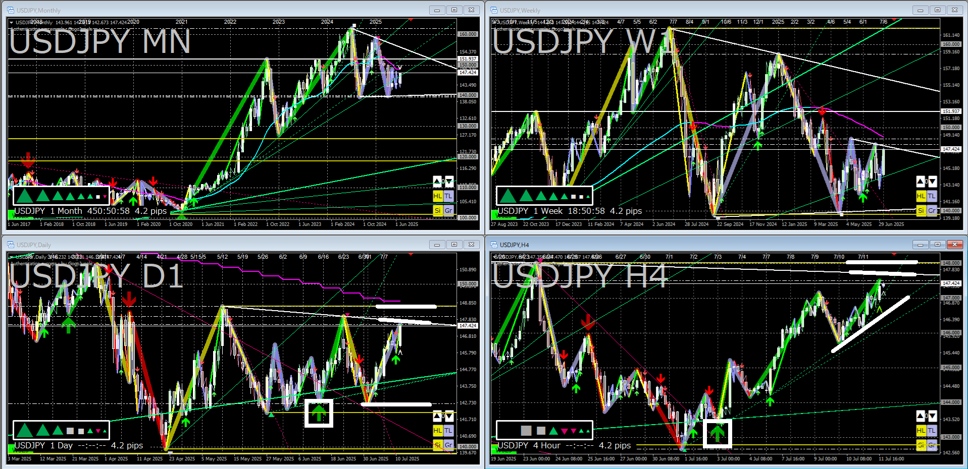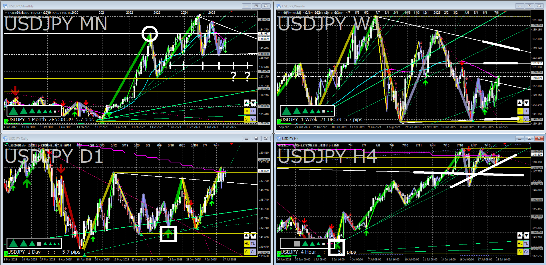 下には、下げ余地があるものの、アップトレンド中ですので、まずは、4時間足の白線を下抜けるか様子見です。