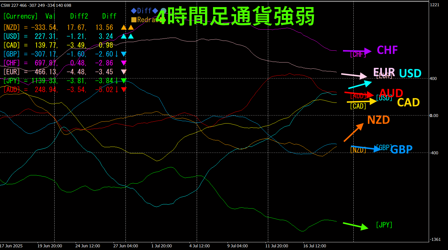 4時間足では、NZD、USD、CADが上向きに、AUD、JPY、EUR、CHF、GBPが下向きになっています。