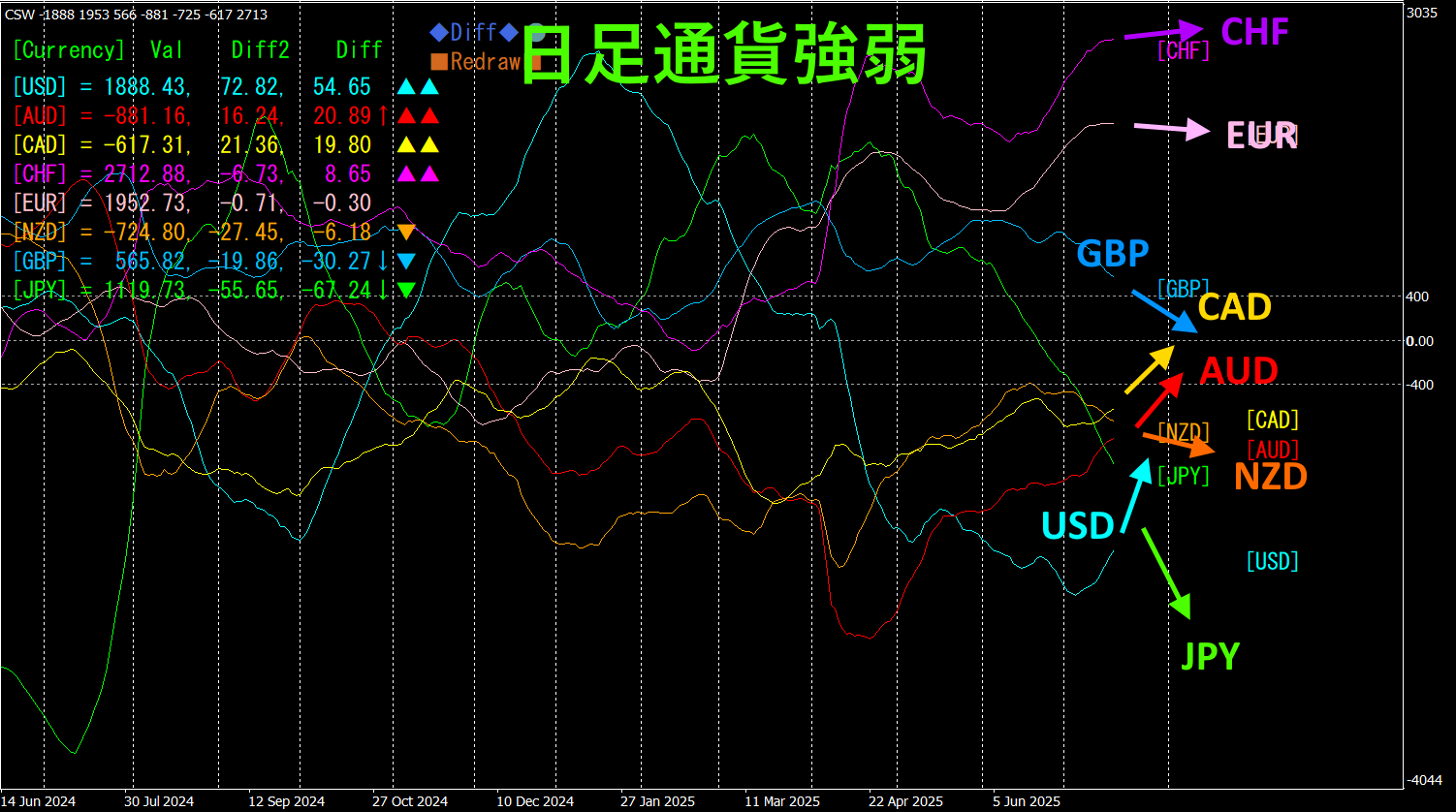 USD、AUD、CAD、CHFが上向きです。一方、JPY、GBP、NZD、EURが下向きになっています。USDの上昇とJPYの下落が目立ちます。