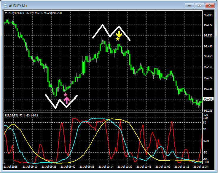 【RCIを極めて勝つ!!】ダブルボトムとダブルトップとmBDSRのサイン 豪ドル円 1分足