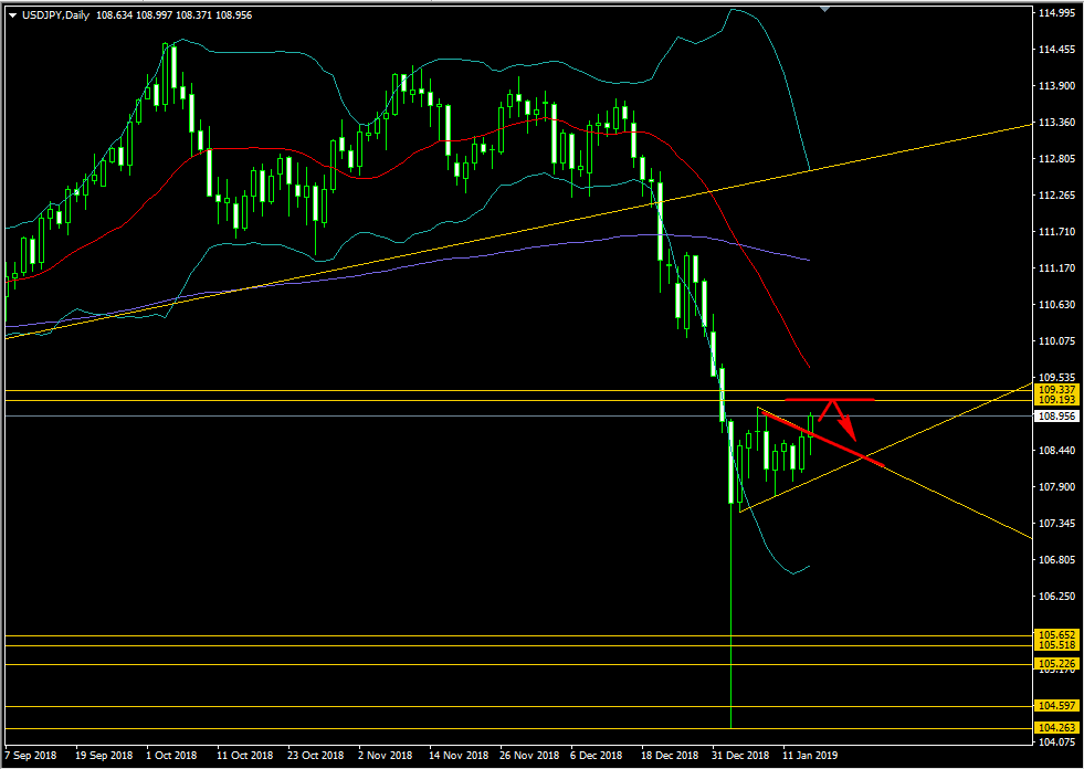 ドル円の日足チャートから見てみます。ドル円日足では、先日のチャートパターン「ペナント」と呼ばれる三角持ち合いを上方向へブレイクし徐々に上方向へ値が進んでいます。しかしながらすぐ上にはかなり強めと思われるドル円109.193円と109.337円のダブルのレジスタンスがあるためここを抜けない限りはまた下へ弾き返されるものと予想されます。このドル円109.193円と109.337円のダブルのレジスタンスに到達するか付近に達するまでは上方向へ行くものと思われます。