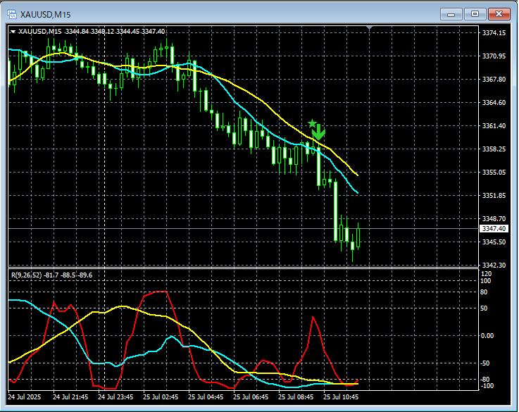 上の5分足では、mBDSR(MA2本フィルター)の戻り売りサインがタイミングよく点灯している。