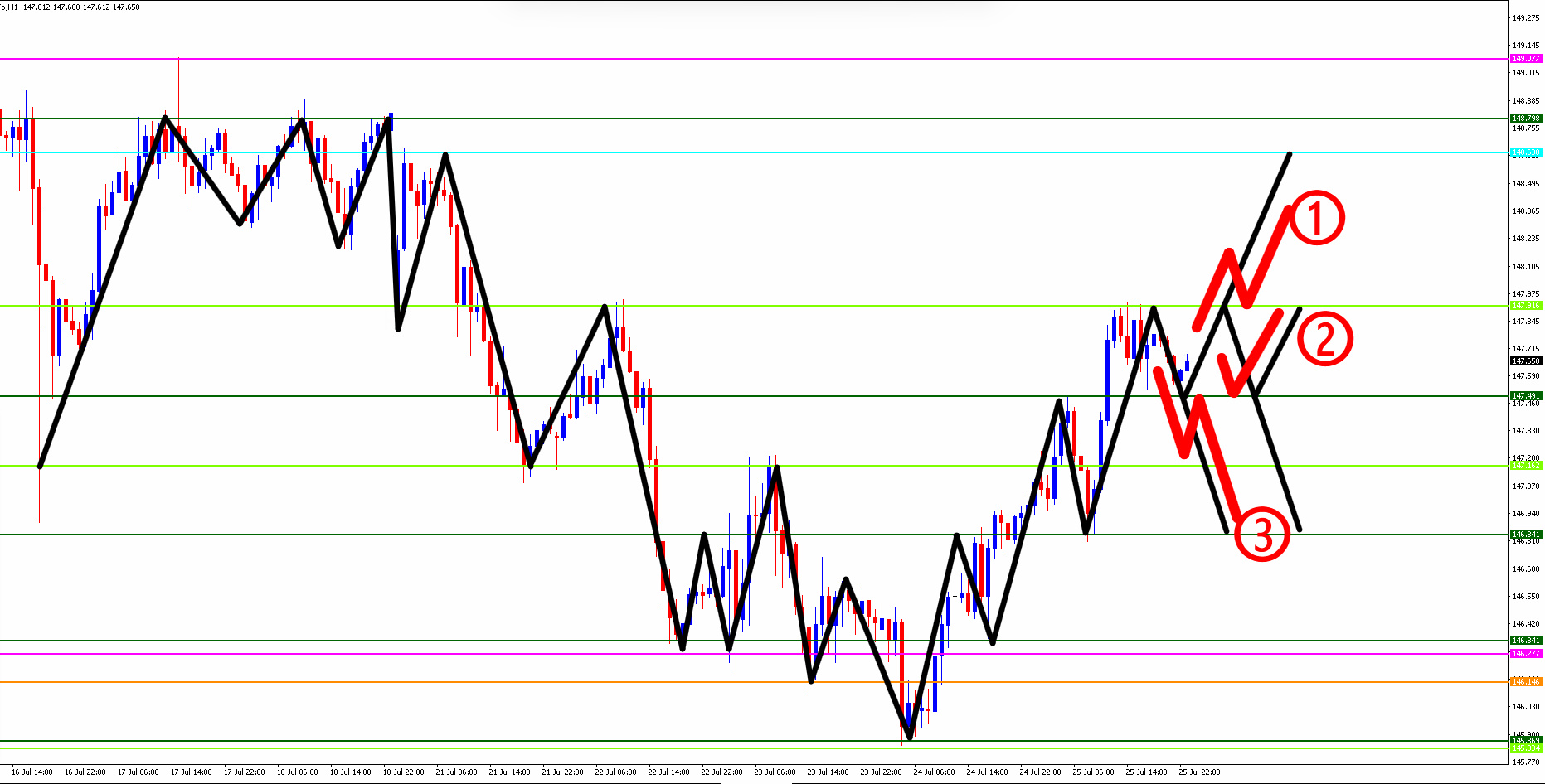 買いに優位性があり、今の位置の②から上昇していくのか、レンジになり146.841円まで下降するのか。