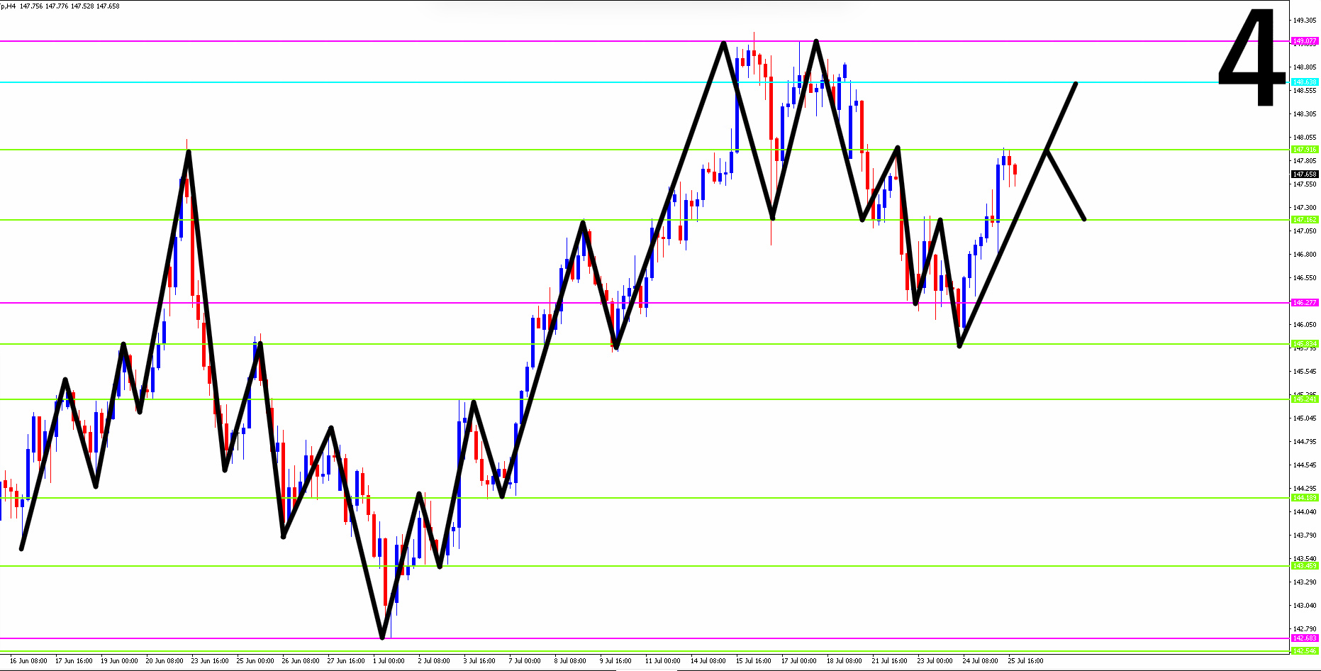 4時間足は買いに優位性があり、現在の高値のレジスタンスラインを突破するのか。147.162円まで下降するのか。