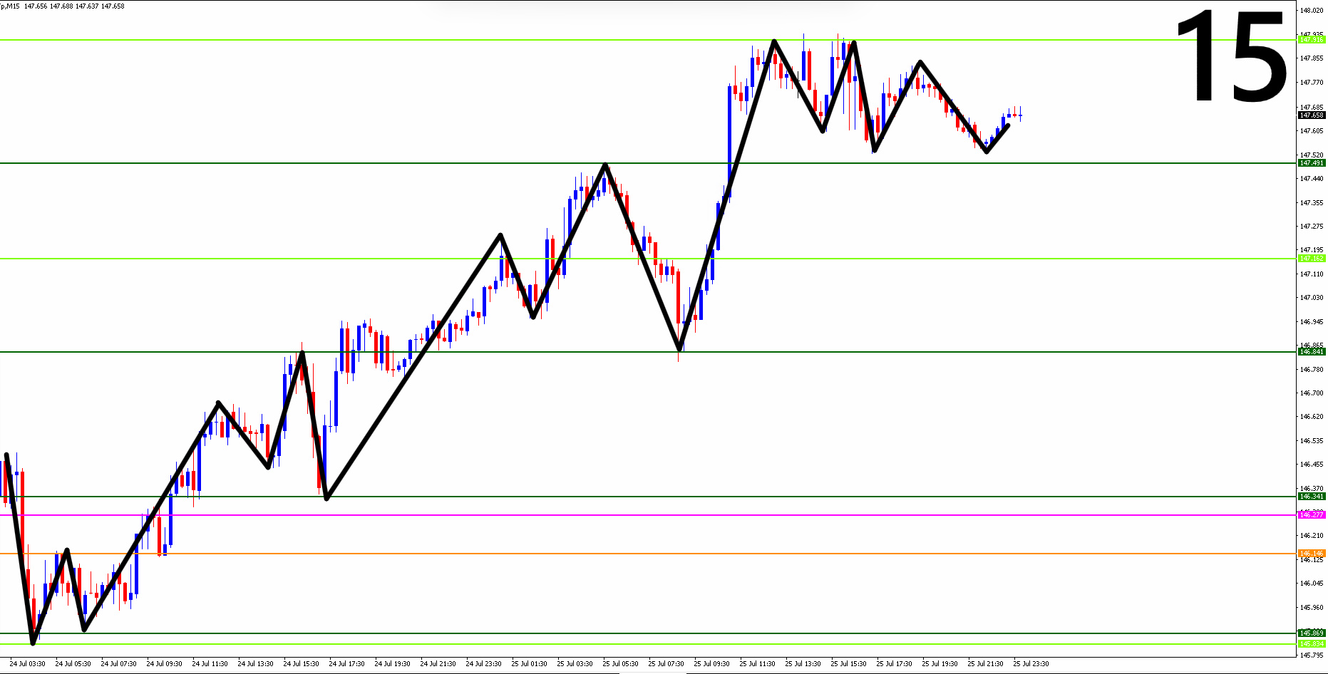 ●日足・4時間足・1時間足・15分足までの相場を水平線と波動(ダウ理論)を使って環境認識し、勝率の高いエントリーポイントを3つに絞る