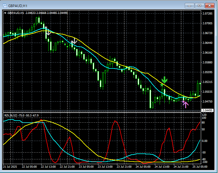 上の1時間足では、mBDSR(MA2本フィルター)とR1R2S2のサインがタイミングよく点灯している。