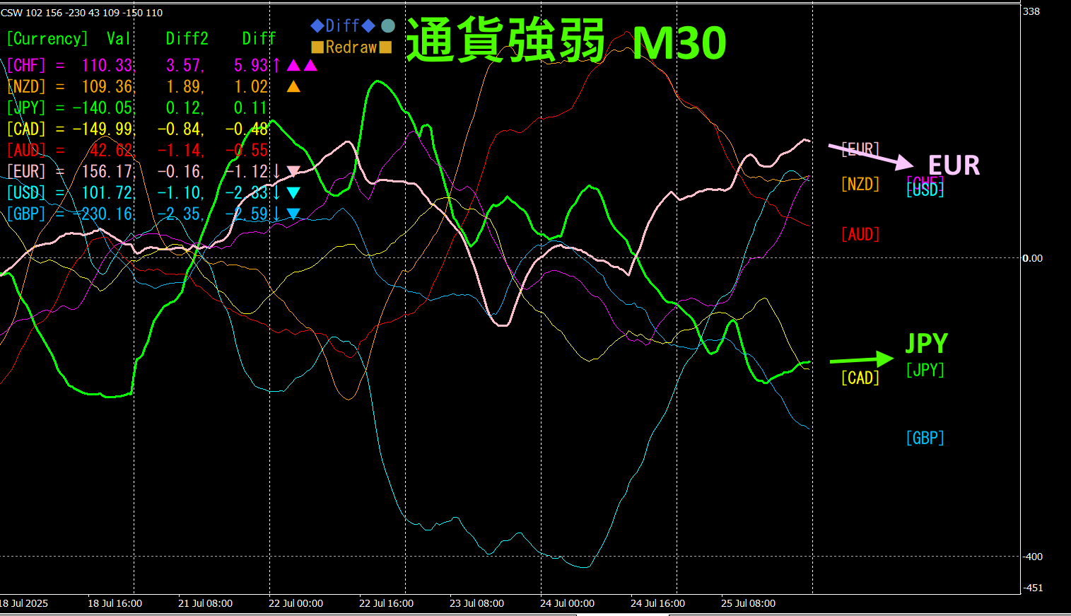 ピンク色がEUR、緑色がJPYです。EURとJPYは、2本のヘビが絡み合う様なグラフになっています。直近の方向では、EURはやや下向き、JYPはやや上向きになっています、はっきりした方向感が出ていません。
