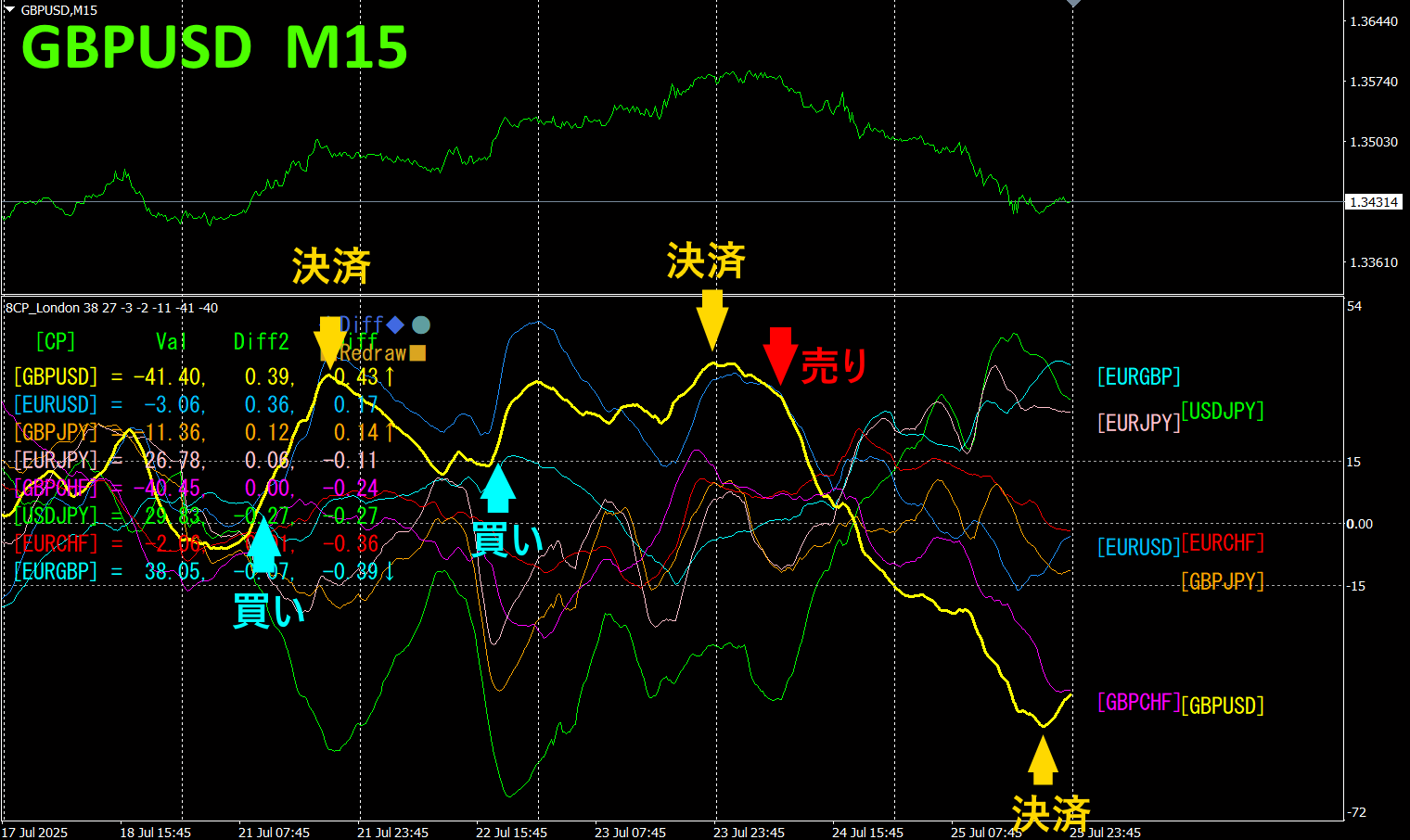 上半分は、GBPUSDの15分足チャートです。下半分は、「8CP見える化インジケータ」によるものです、黄色太線のグラフがGBPUSDに相当します