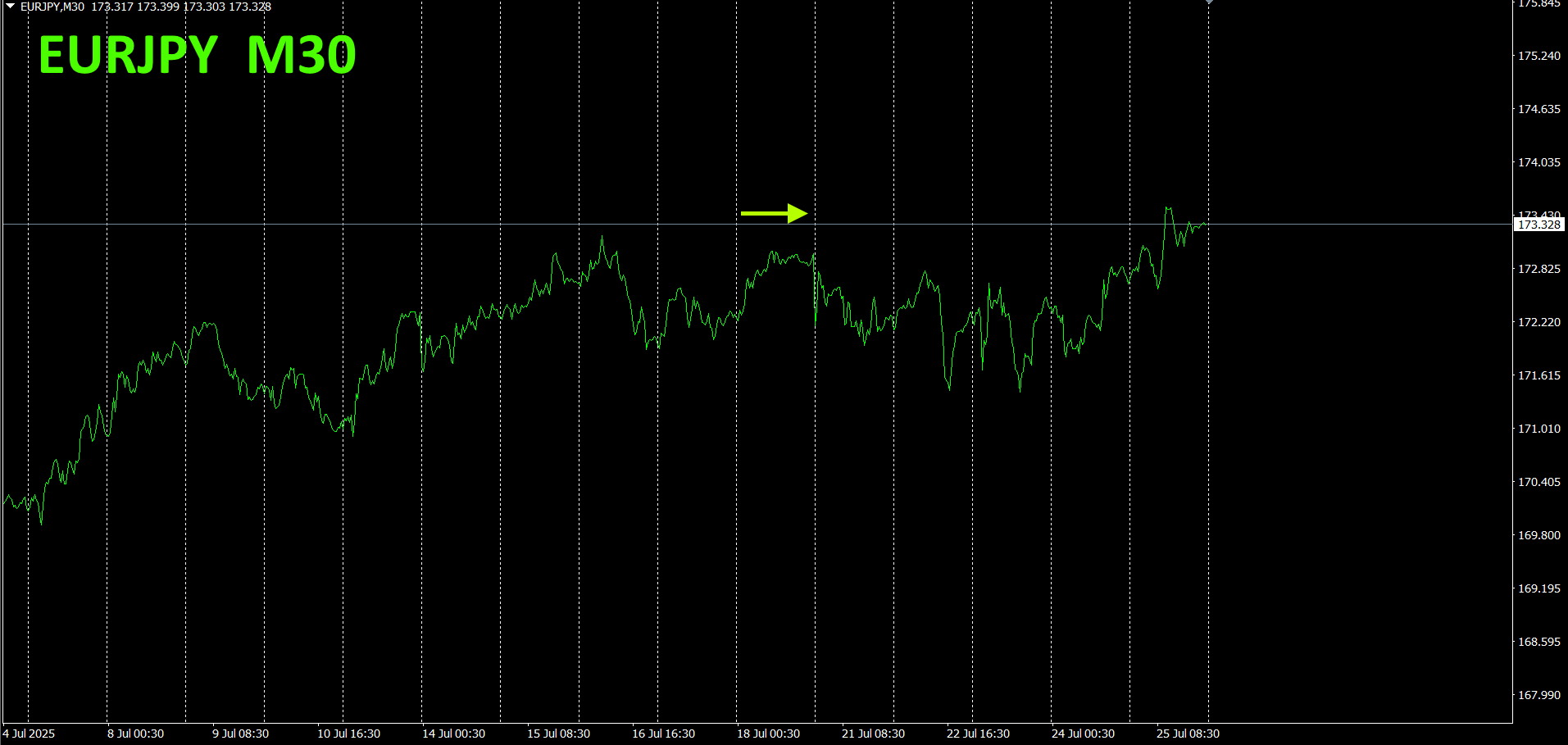 30分足の通貨強弱チャートで、EURもJPYも、ほとんど水平方向で、方向感がはっきりしません。今後EURJPYは、レンジ状態に推移すると予想されます。