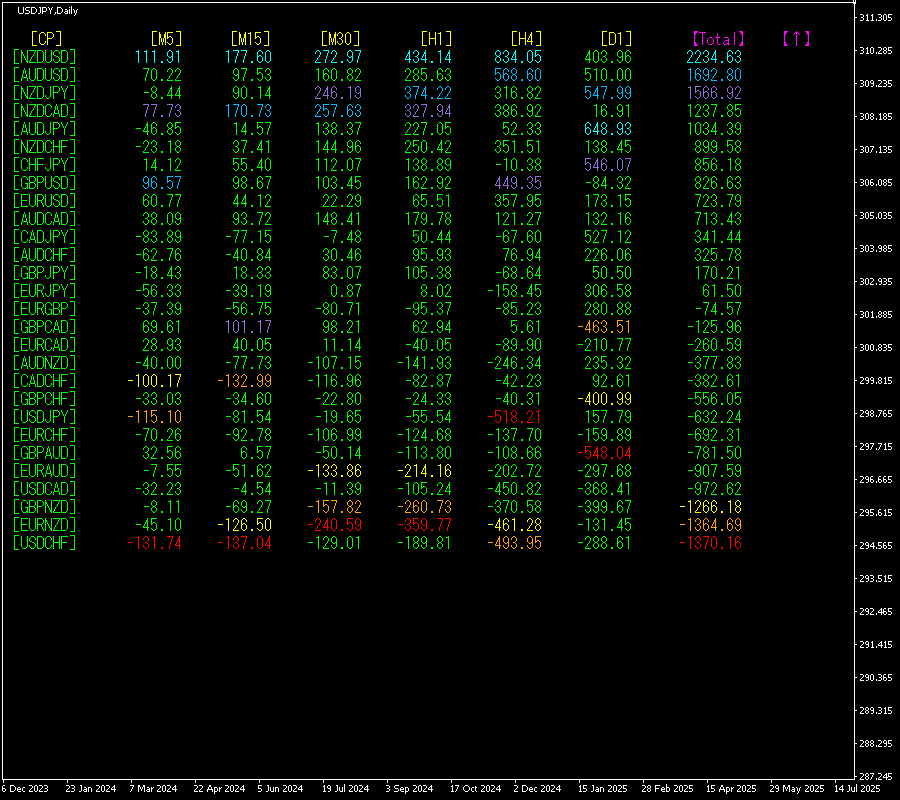 Total]数値の降順に並んでいます。一番上にあるNZDUSDは、[D1]を除く全ての時間足で青色系の表示色になっています。Total数値が+2234.63と、大きいプラスの数字になっています。AUDJPYに上昇トレンドが発生していることが明らかです。