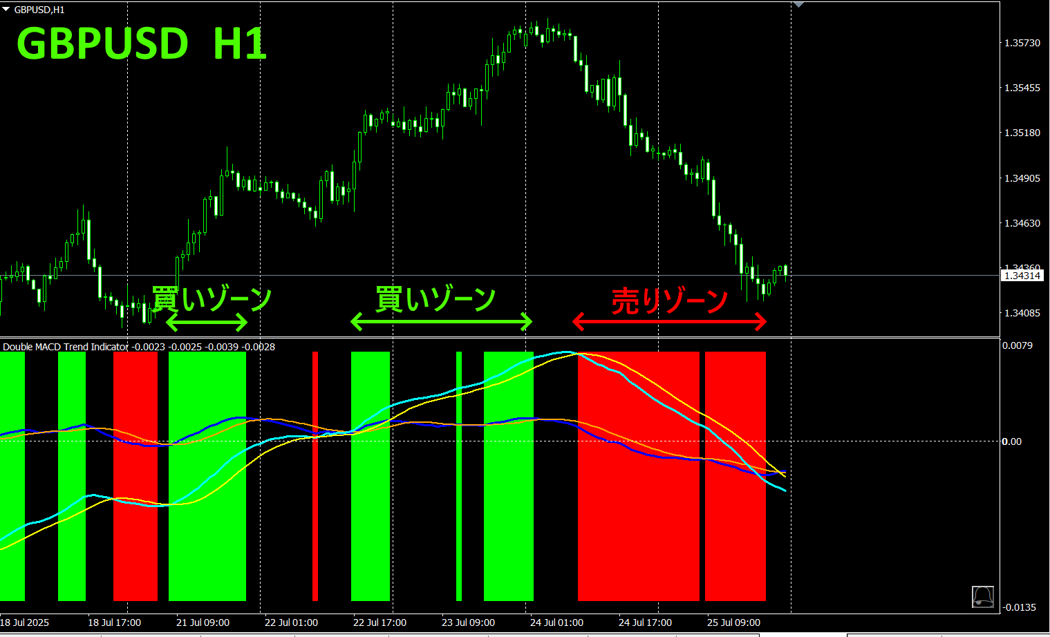 このインジケータを導入すれば、買いゾーンと売りゾーンが、色分けされるので、売り、買いに迷うことがありません。