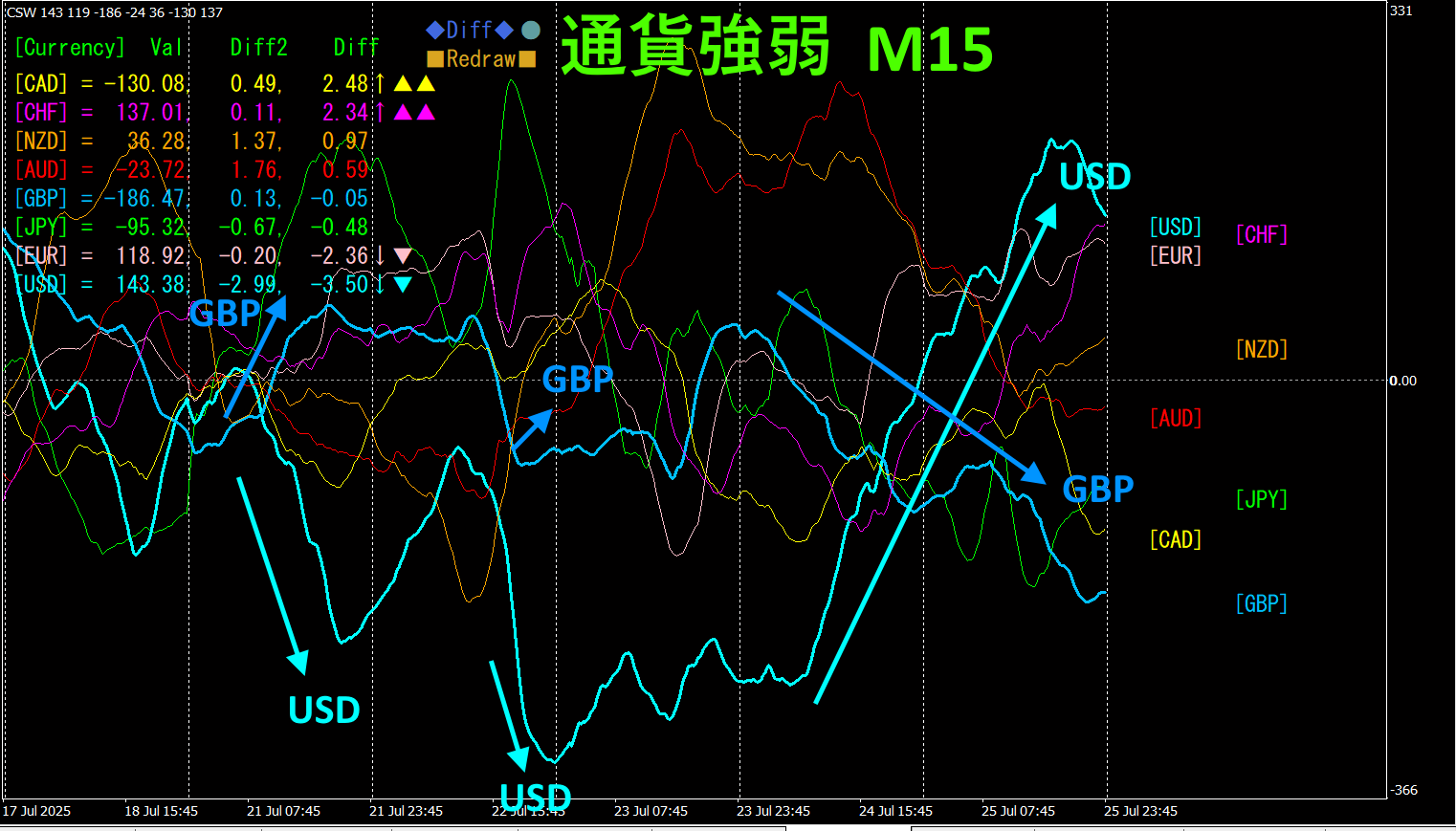 15分足の通貨強弱グラフを見ると、GBPとUSDが、見事な逆相関関係になっていることがわかります。今一番大きく伸びていて、逆相関関係にある通貨ペアを選びトレードすれば、自ずと結果が付いてくるのです。
