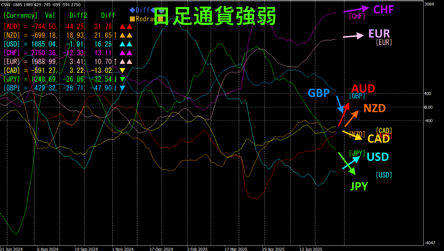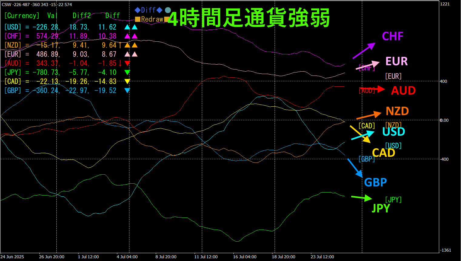 4時間足では、USD、CHF、NZD、EURが上向きに、GBP、CAD、JPY、AUDが下向きになっています。