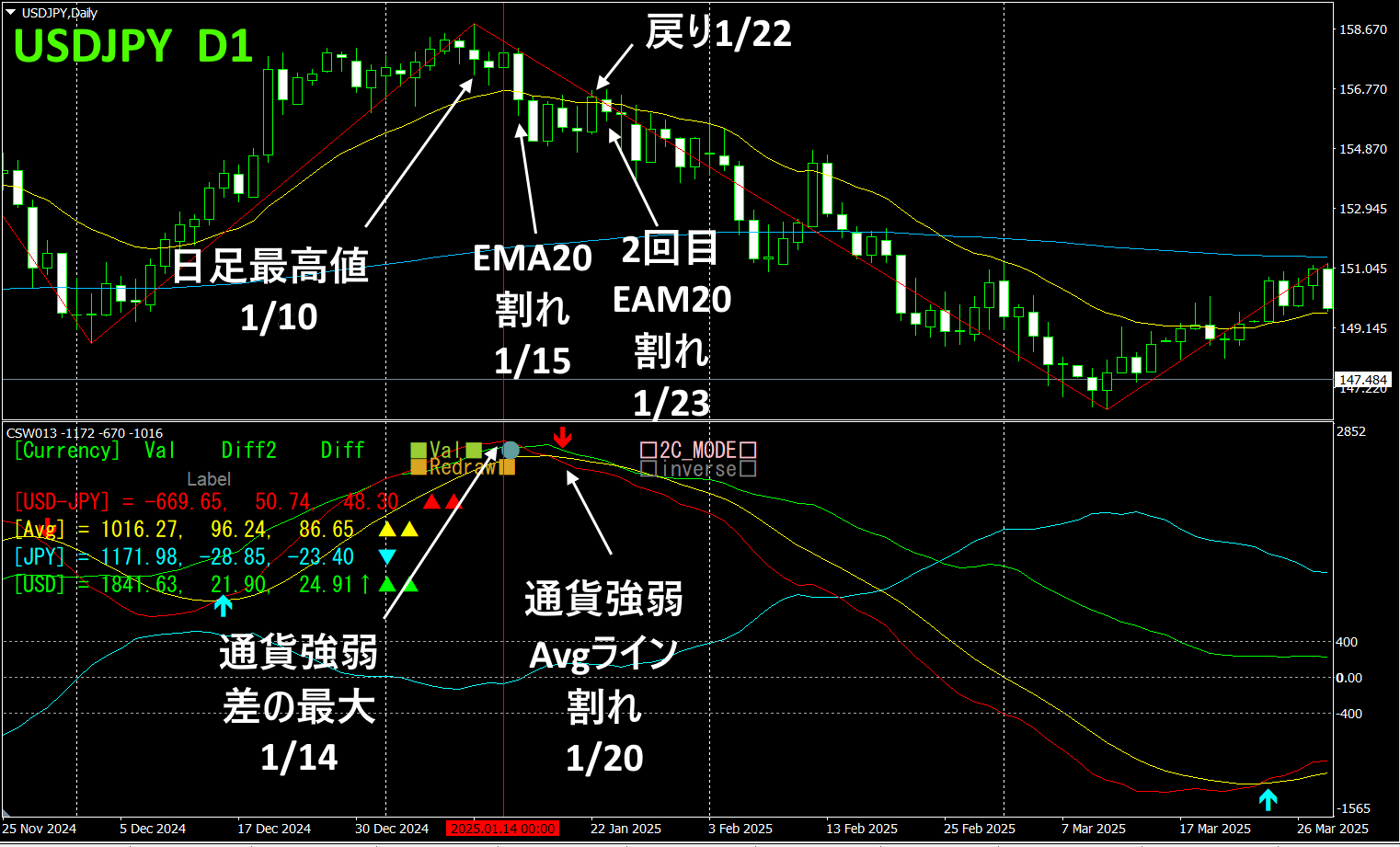 上半分がUSDJPYの日足ローソク足チャート、下半分が通貨強弱インジケータによるものです。