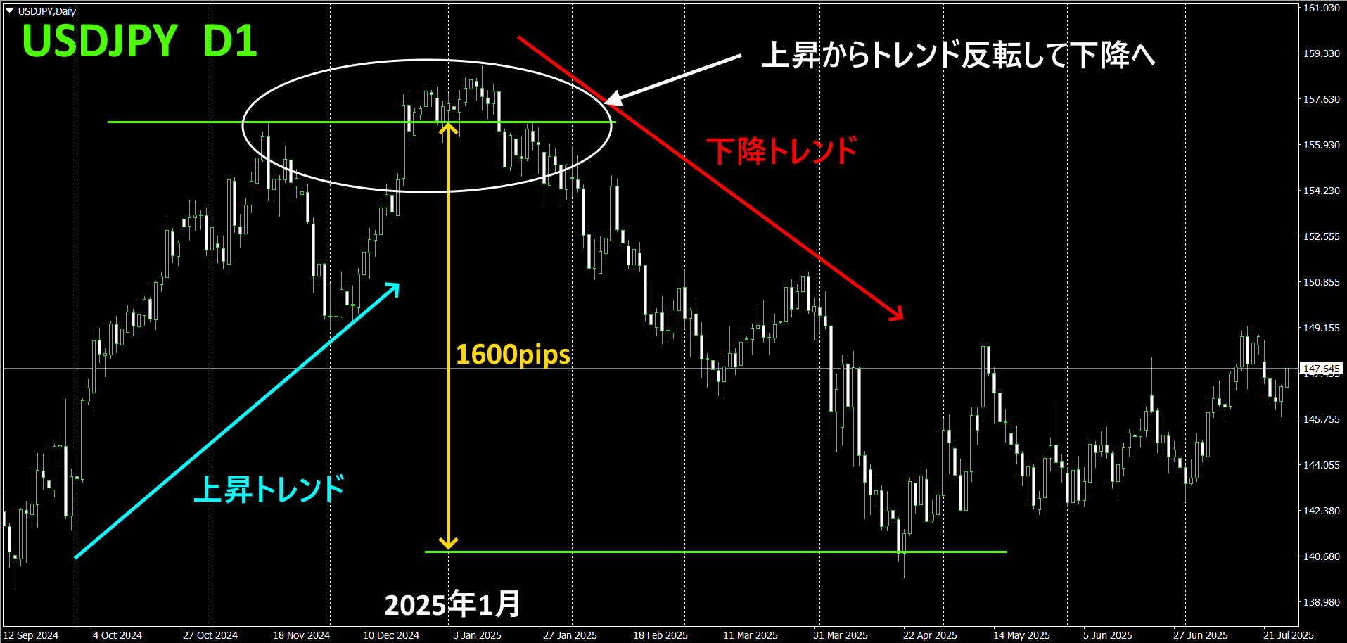 USDJPYの日足チャートを振り返って分析すると、2025年1月に、上昇トレンドから下降トレンドへのトレンド反転を起こしています。