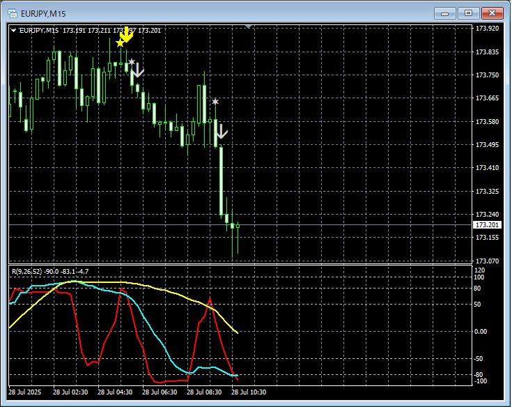 mBDSR(RCI2本フィルター)のサインとR1R2S2のサインの両方を活用する(40) ユーロ円 15分足