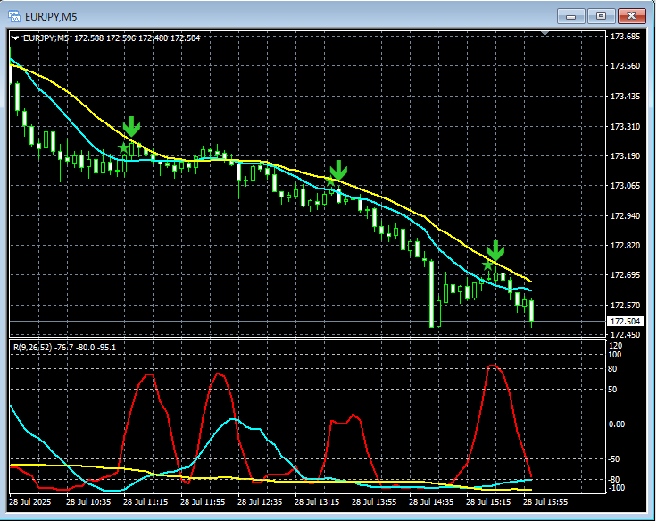 【RCIを極めて移動平均線フィルターで勝つ!! ユーロ円 5分足】mBDSRの戻り売りサイン