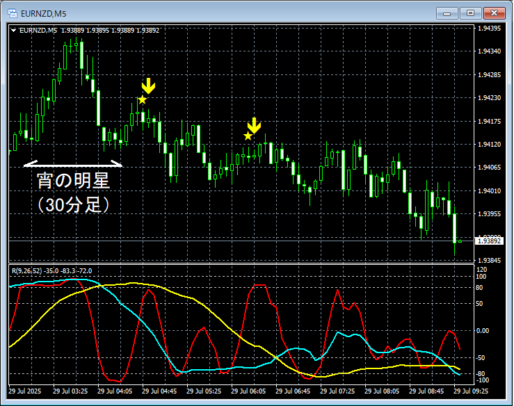 上の1時間足では、30分足で宵の明星(酒田五法)が出現して下げた後の上昇でmBDSR(RCI2本フィルター)の戻り売りサインが点灯してプライスはさらに下げている。