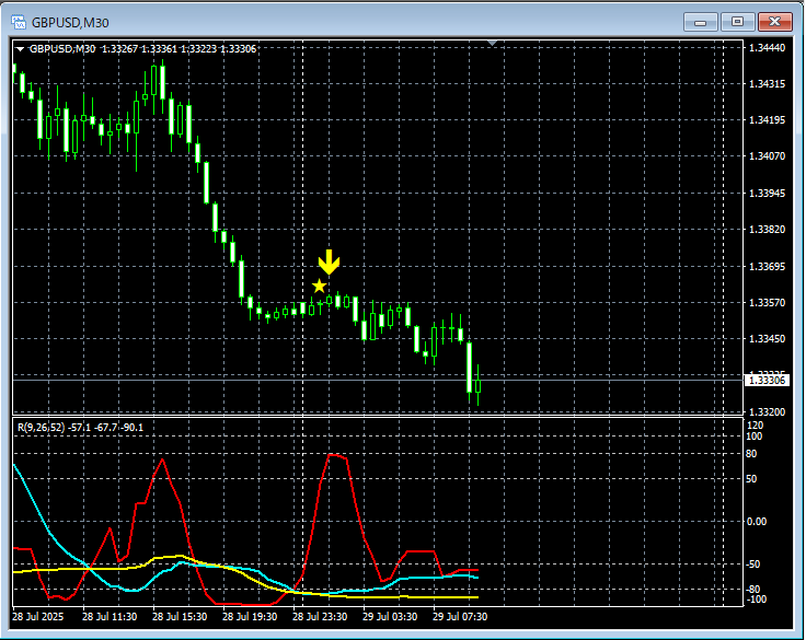 上の30分足では、mBDSR(RCI2本フィルター)の戻り売りサインがタイミングよく点灯している。